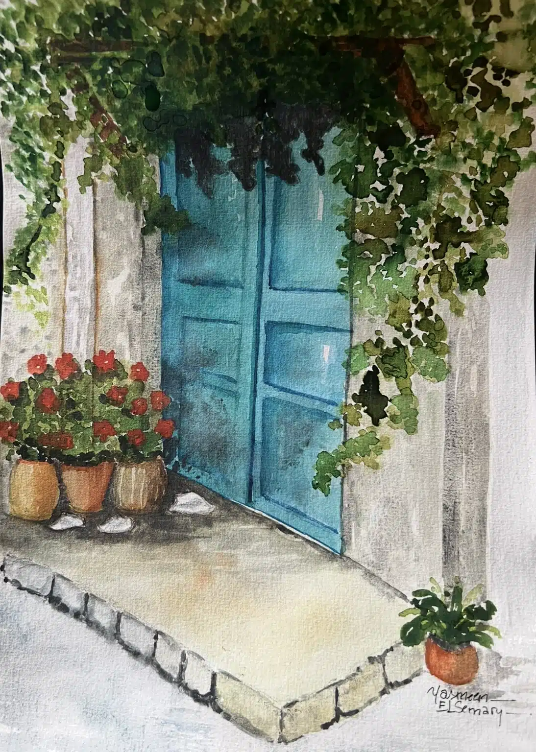 watercolor painting holding the blue door of an authentic home. Size 21x 31 & the frame is Customize