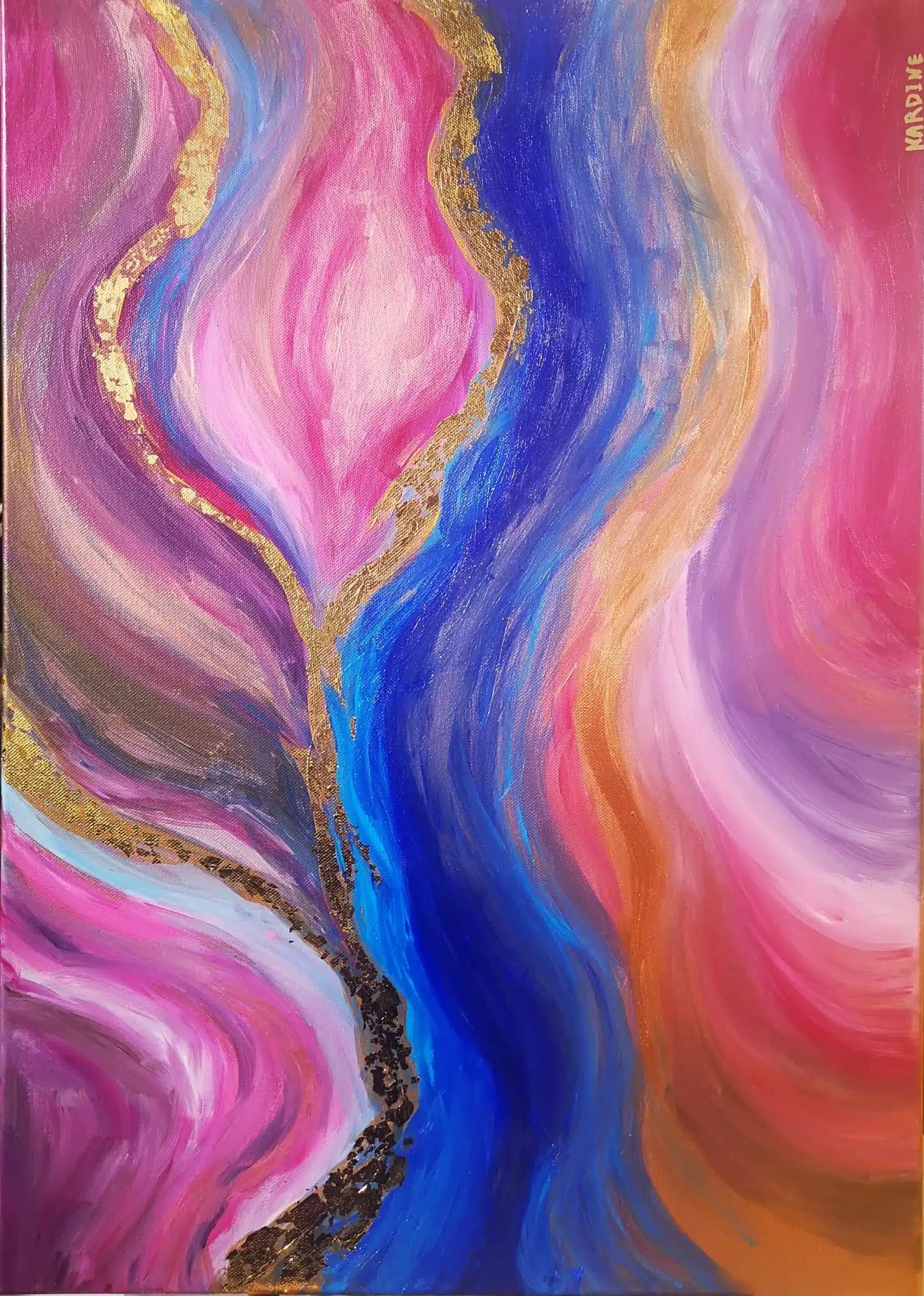 This is an abstract acrylic painting with the main colors pink, blue, gold and gold leaves.