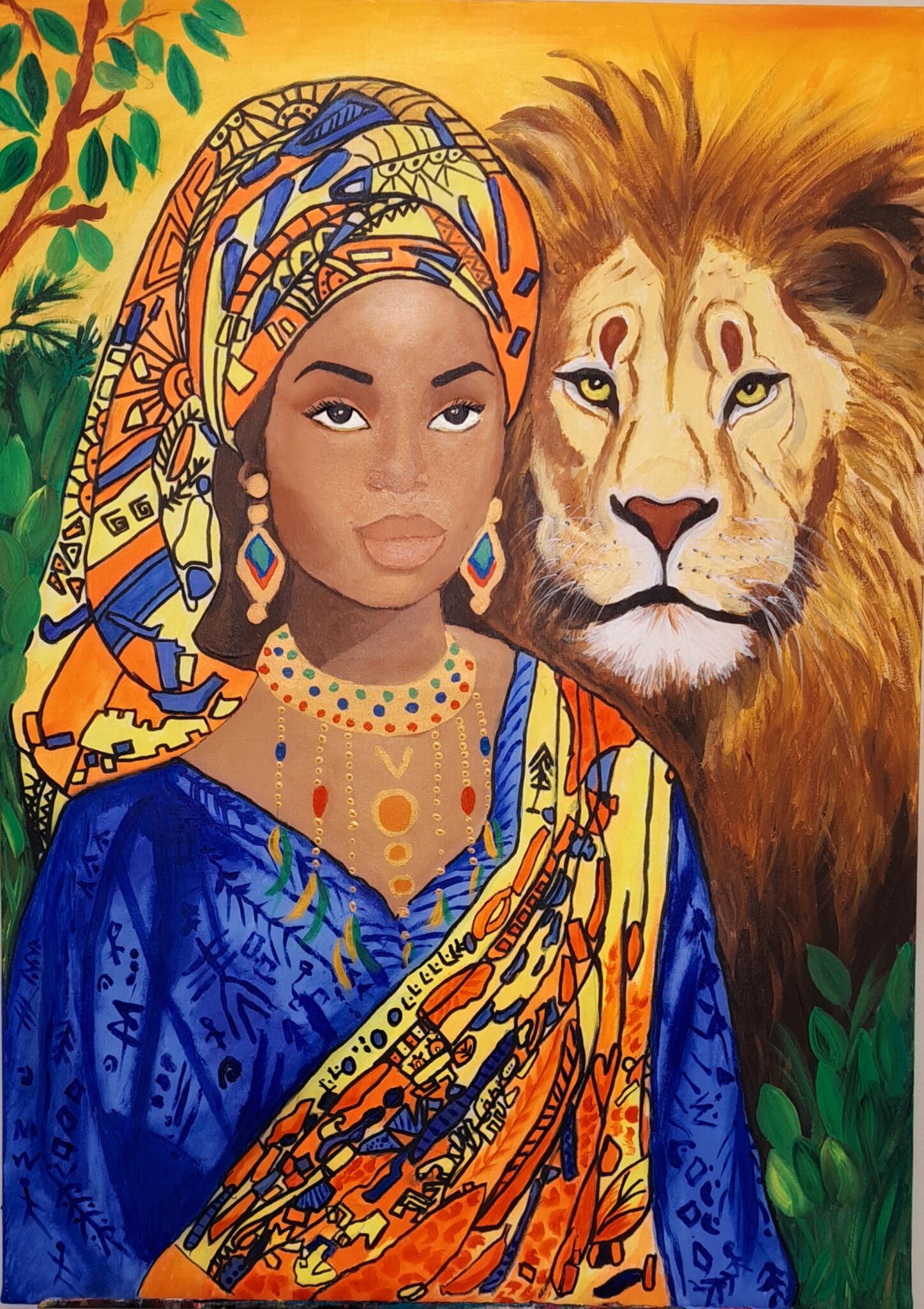 A regal African woman in colorful traditional attire stands beside a majestic lion , symbolizing courage , pride , and the deep connection between humanity and wild.