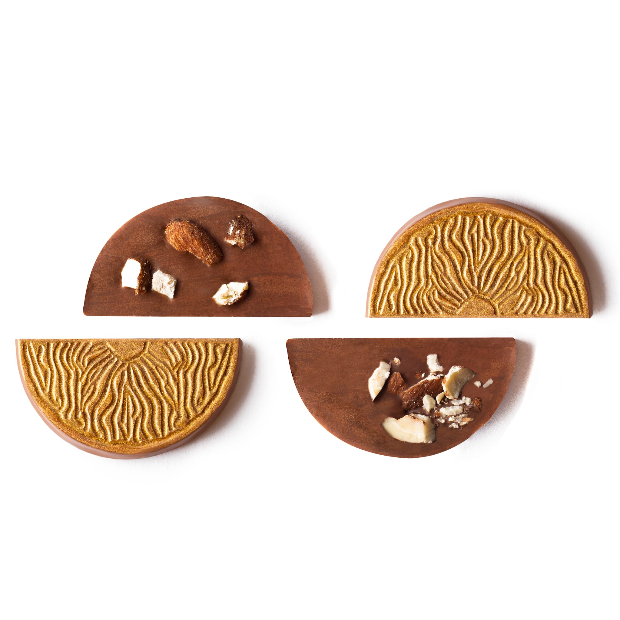 Box of tiny 6 pcs milk swiss chocolate no palm oil added decorated with croquet and salted almonds