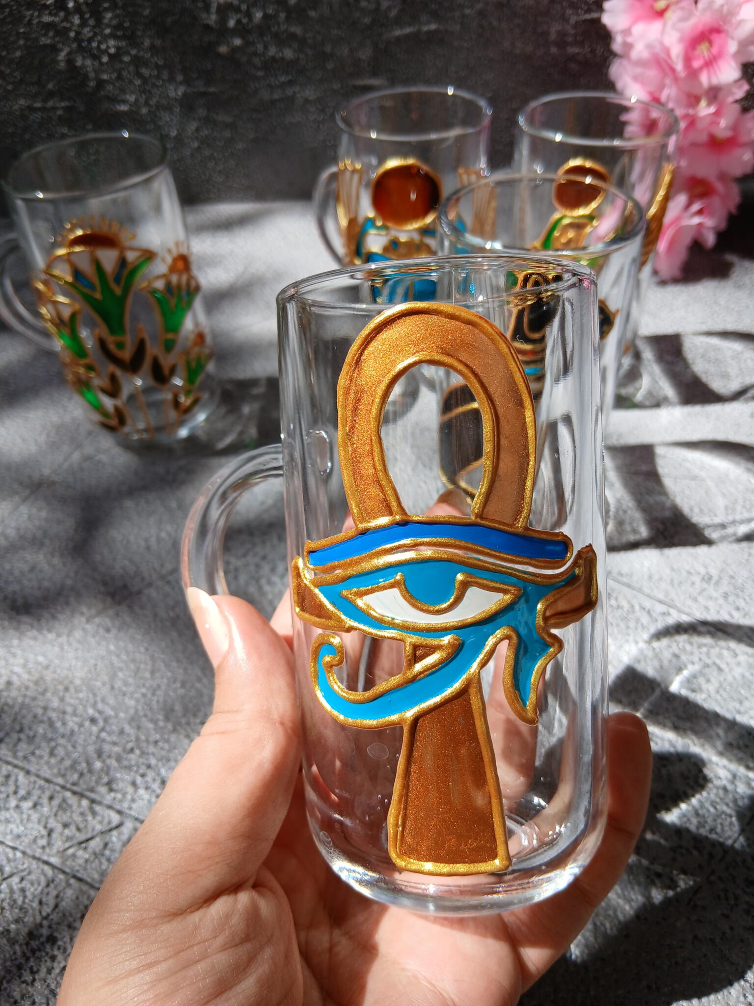 Add an artistic and elegant touch to your table with this hand-painted glass mug set, featuring designs inspired by the symbols of ancient Egypt — such as the Eye of Horus, Lotus Flower, Scarab Beetle, and Goddess Bastet.
