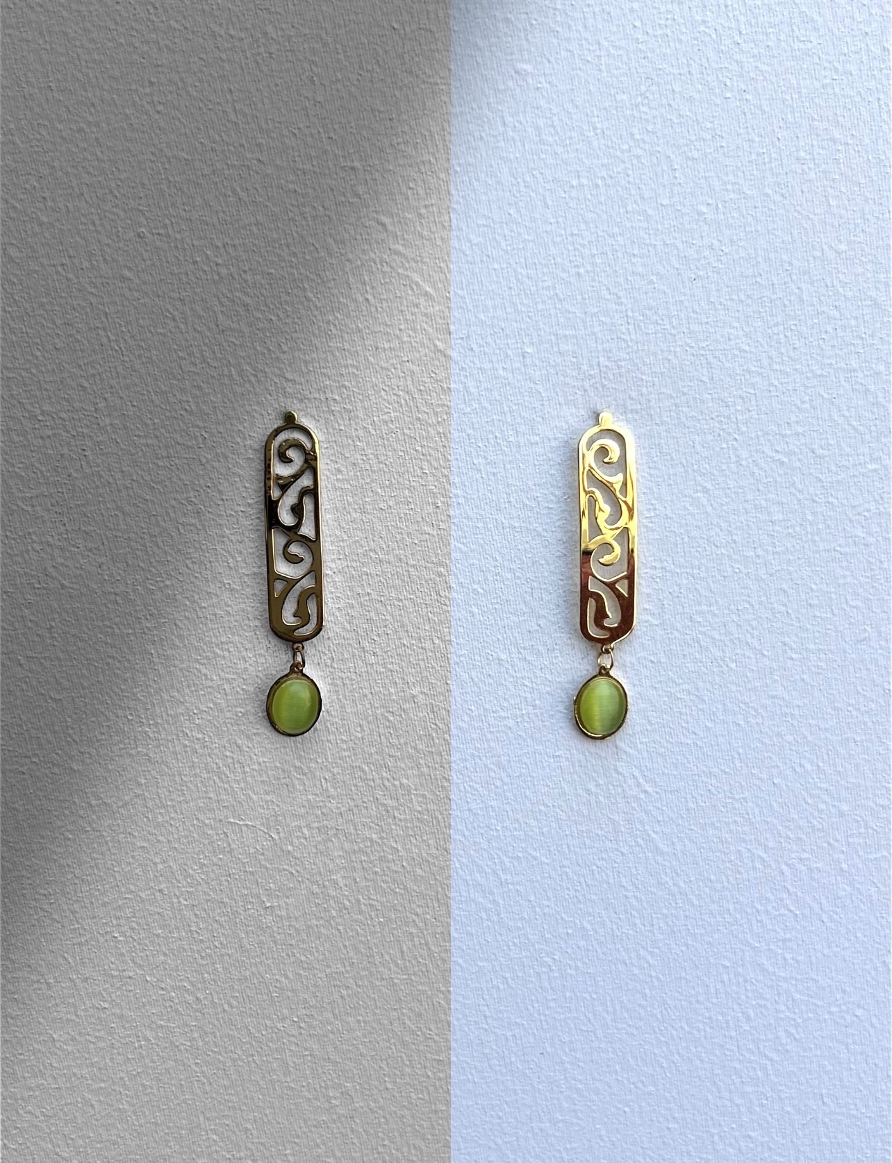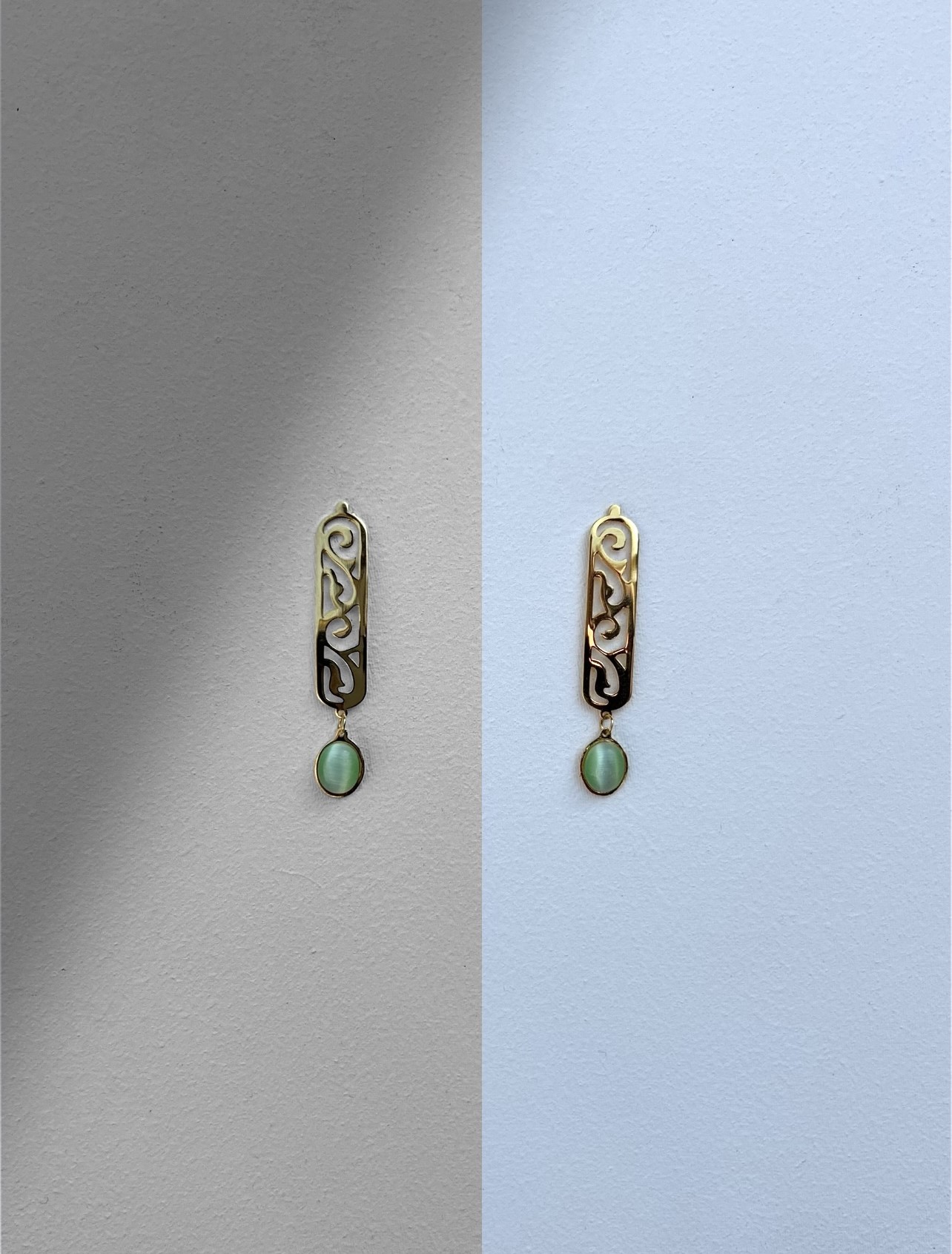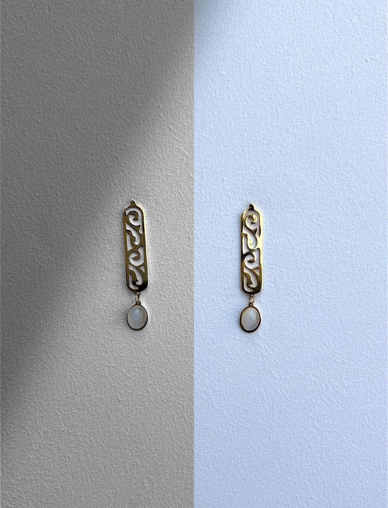 A graceful earring inspired by the rich artistry of Arabic design. The vertical silhouette is adorned with a dangling gemstone that adds refined movement and timeless charm to any outfit.