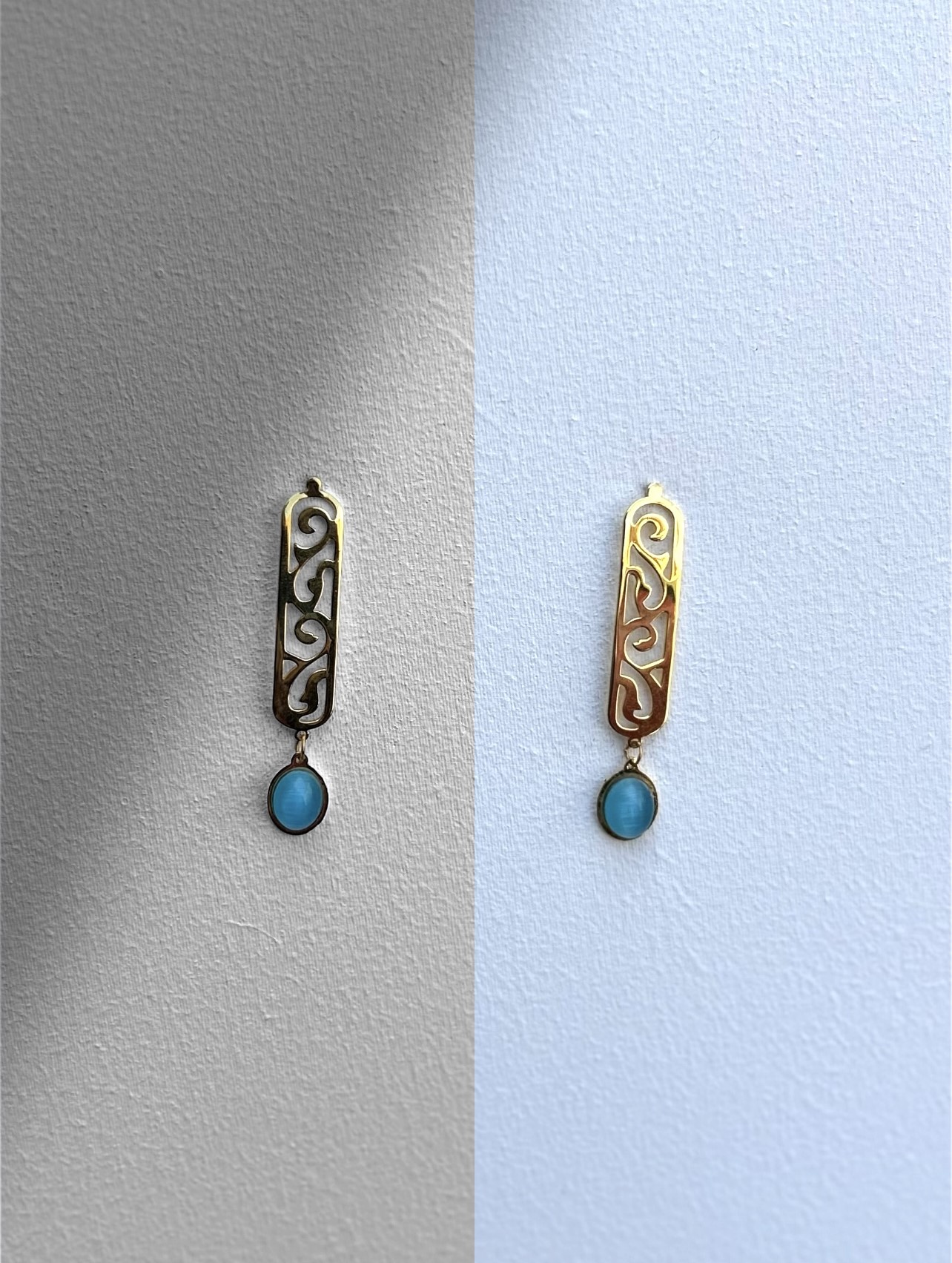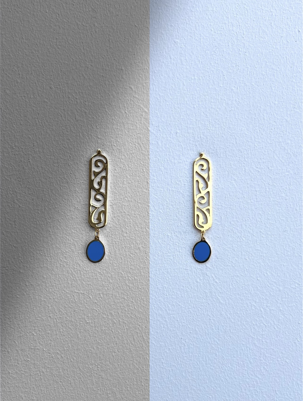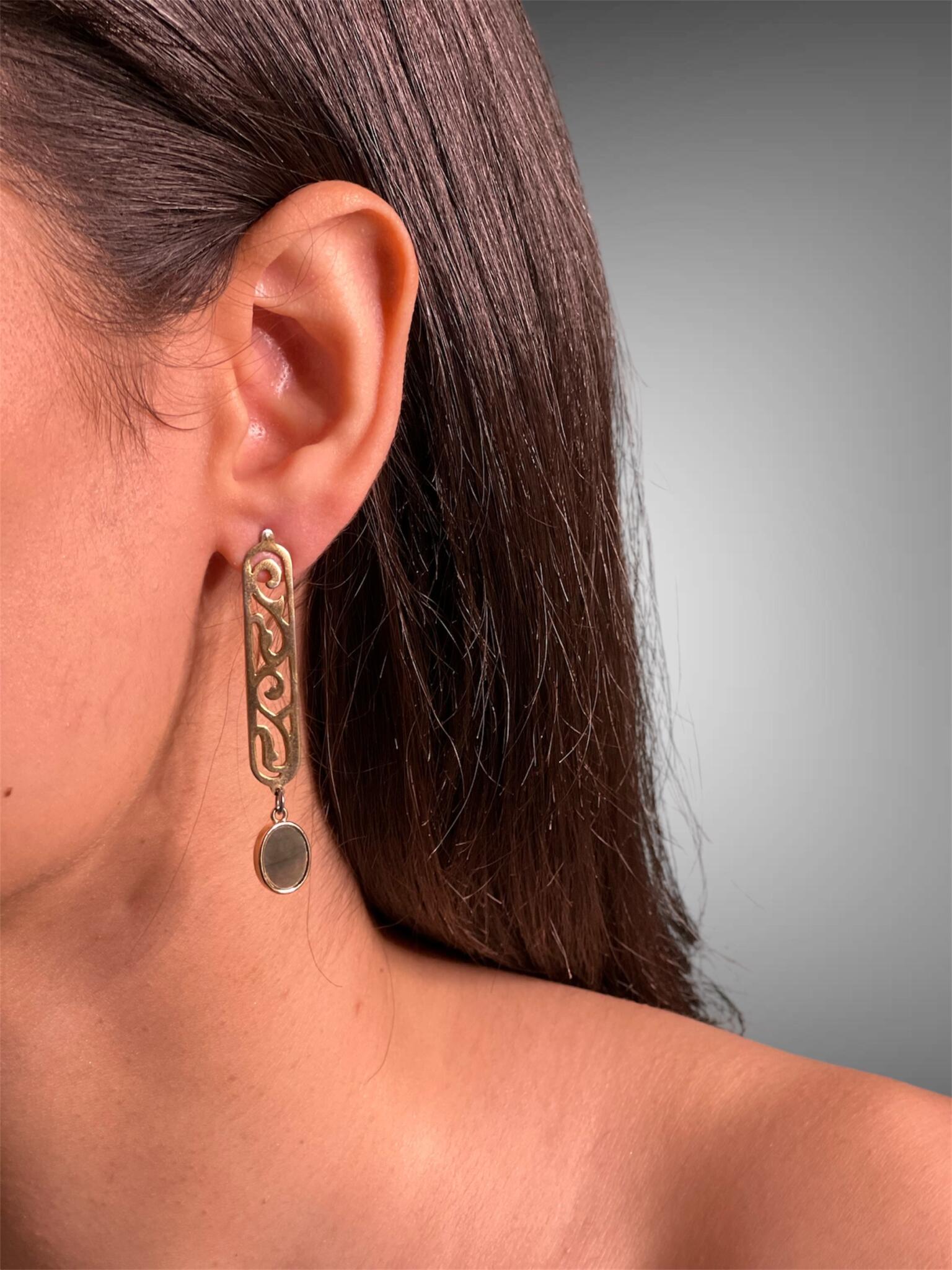 A graceful earring inspired by the rich artistry of Arabic design. The vertical silhouette is adorned with a dangling gemstone that adds refined movement and timeless charm to any outfit.