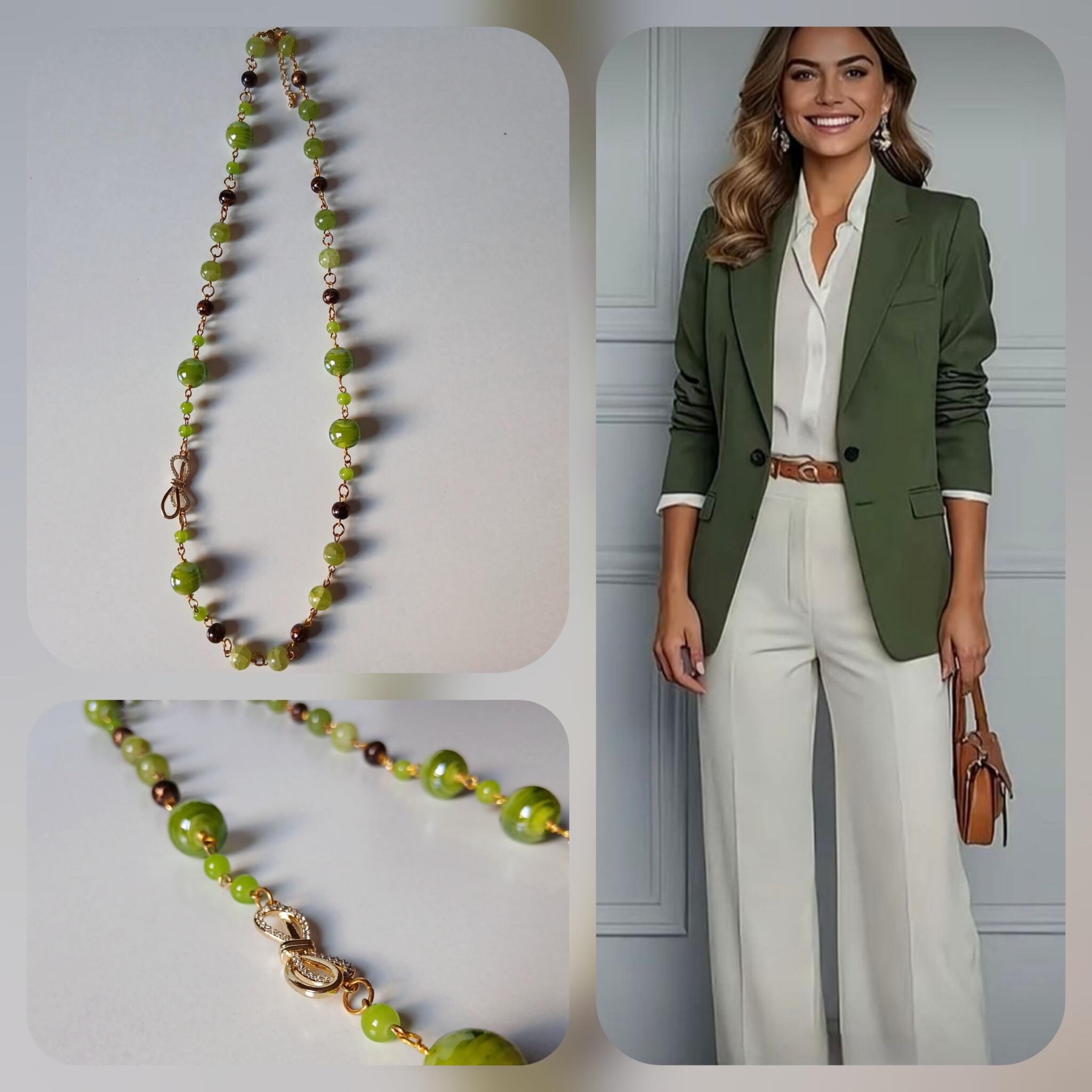 Long necklace made of alabaster and murano glass stones in apple green and brown stones with a golden knot pendant with zircon tiny diamonds