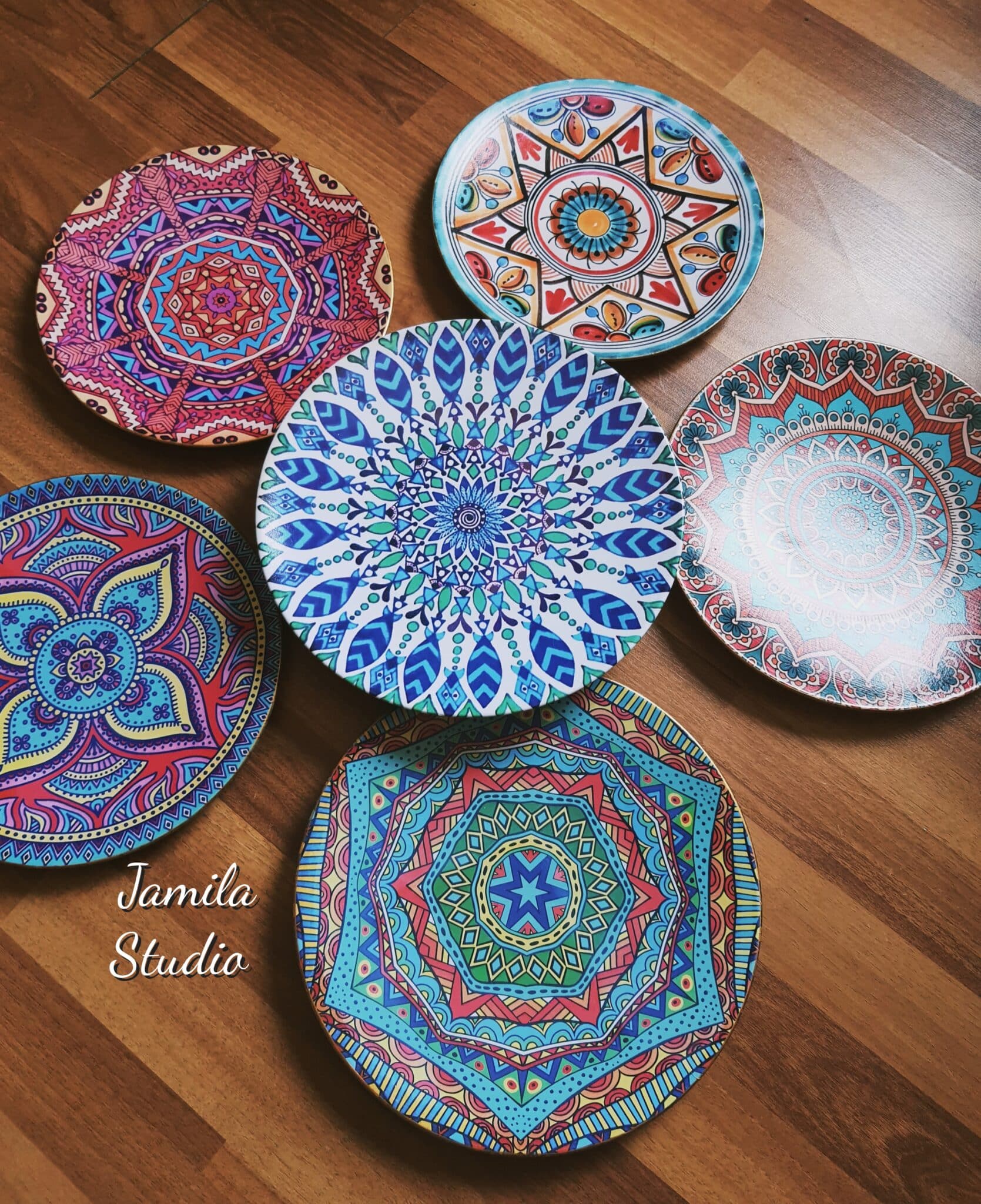 *Set of 6 colorful Porcelain wall plates.