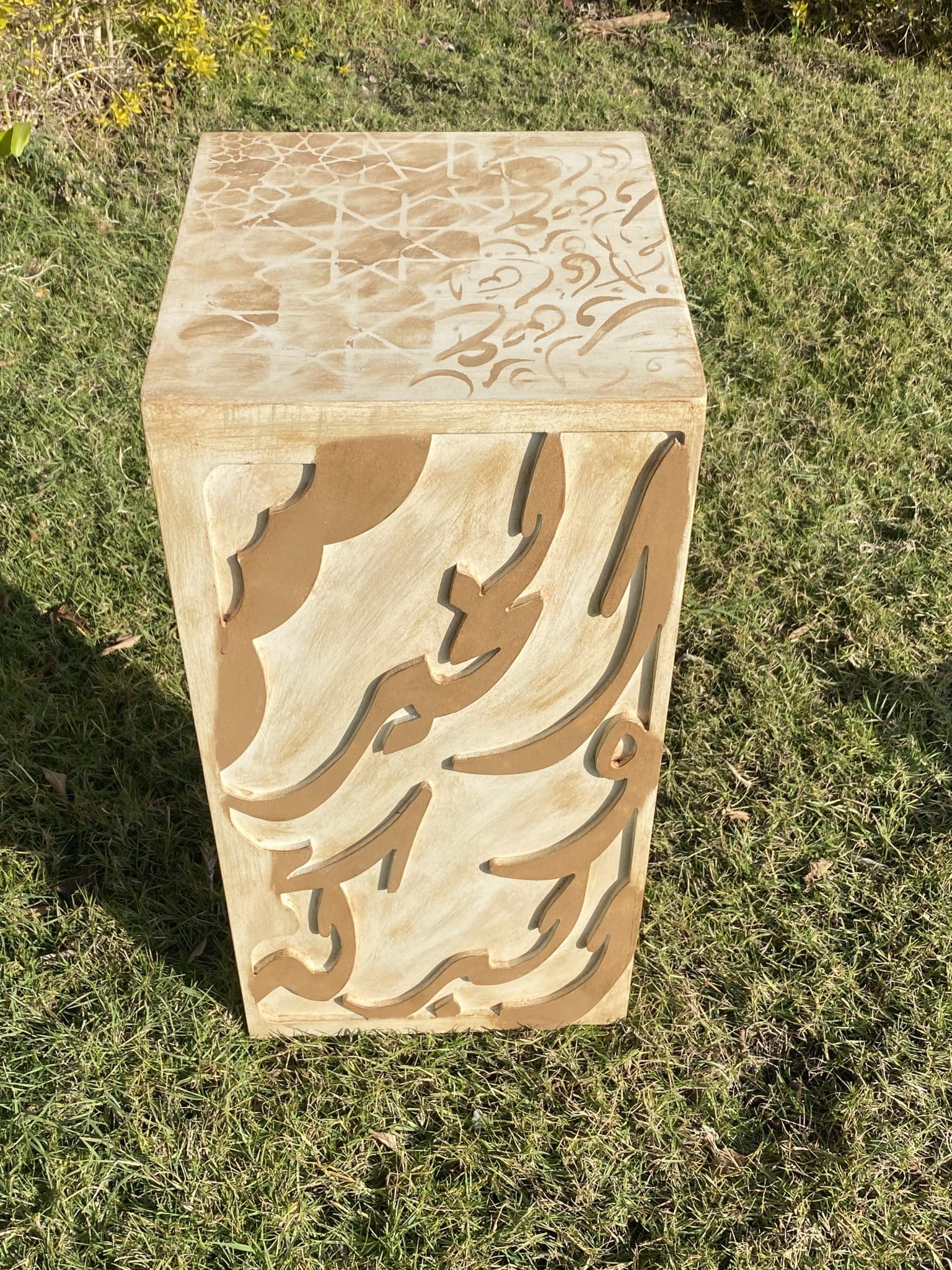 Wooden sofa side table in beige x brown colors and Arabic calligraphy design