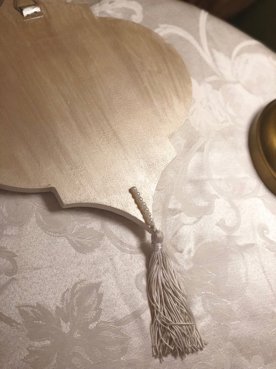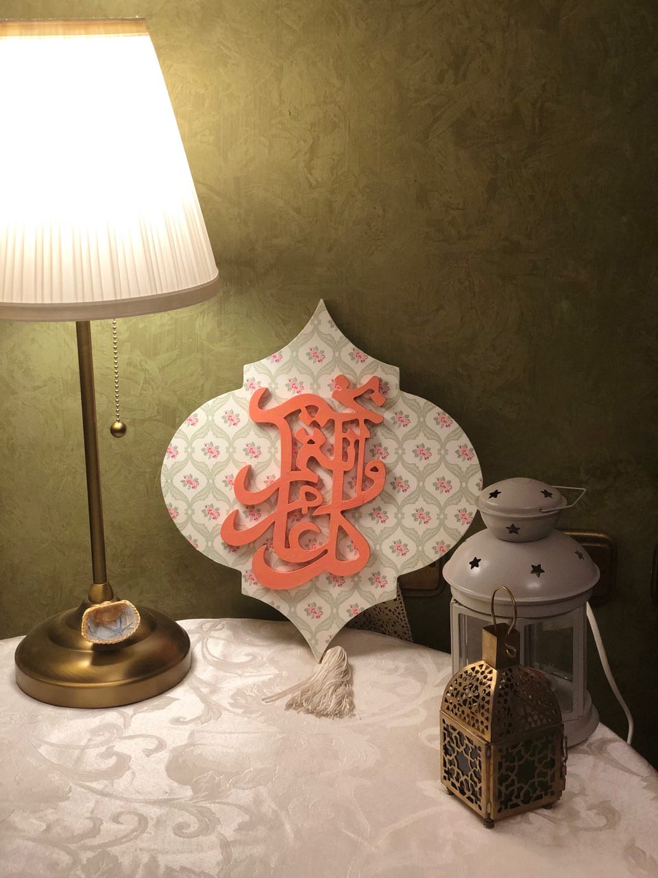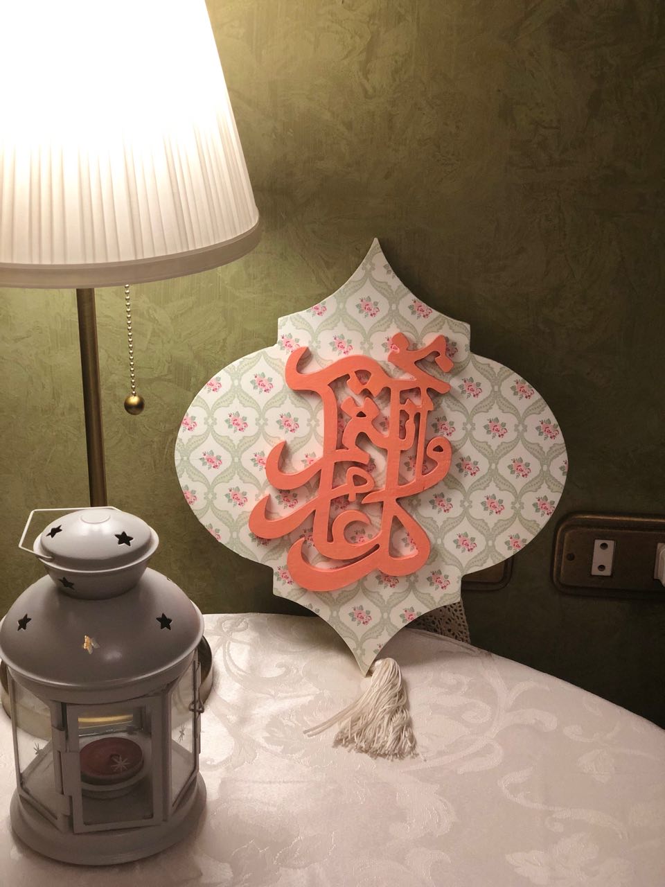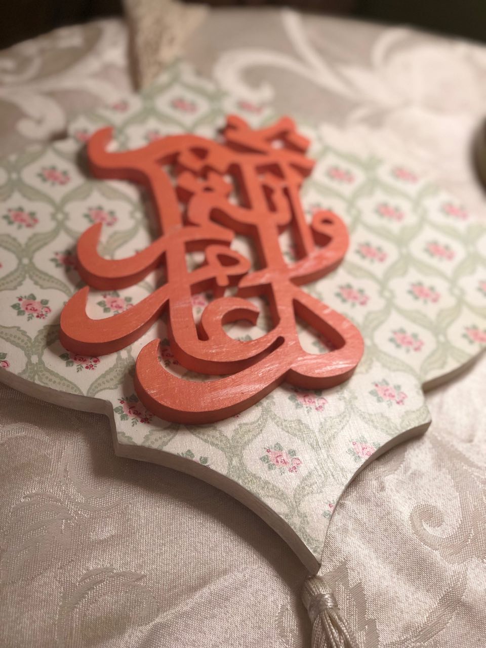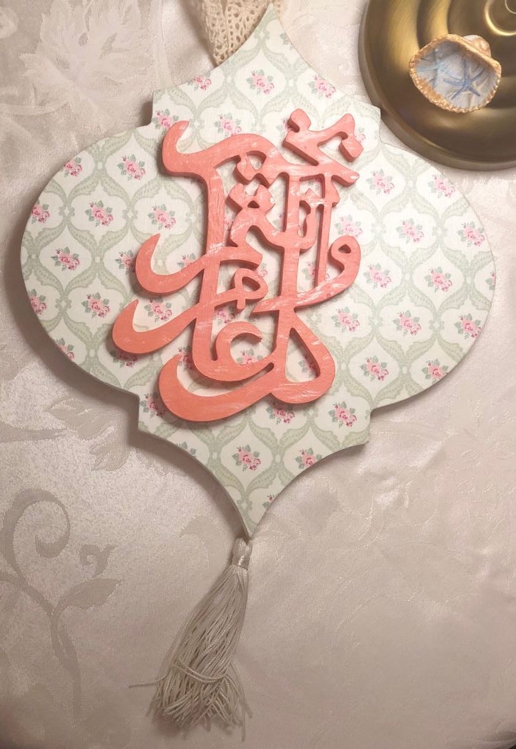 A shabby chic inspired decoupaged wall hanging featuring intricate Arabic Calligraphy layered over a pastel colored background.