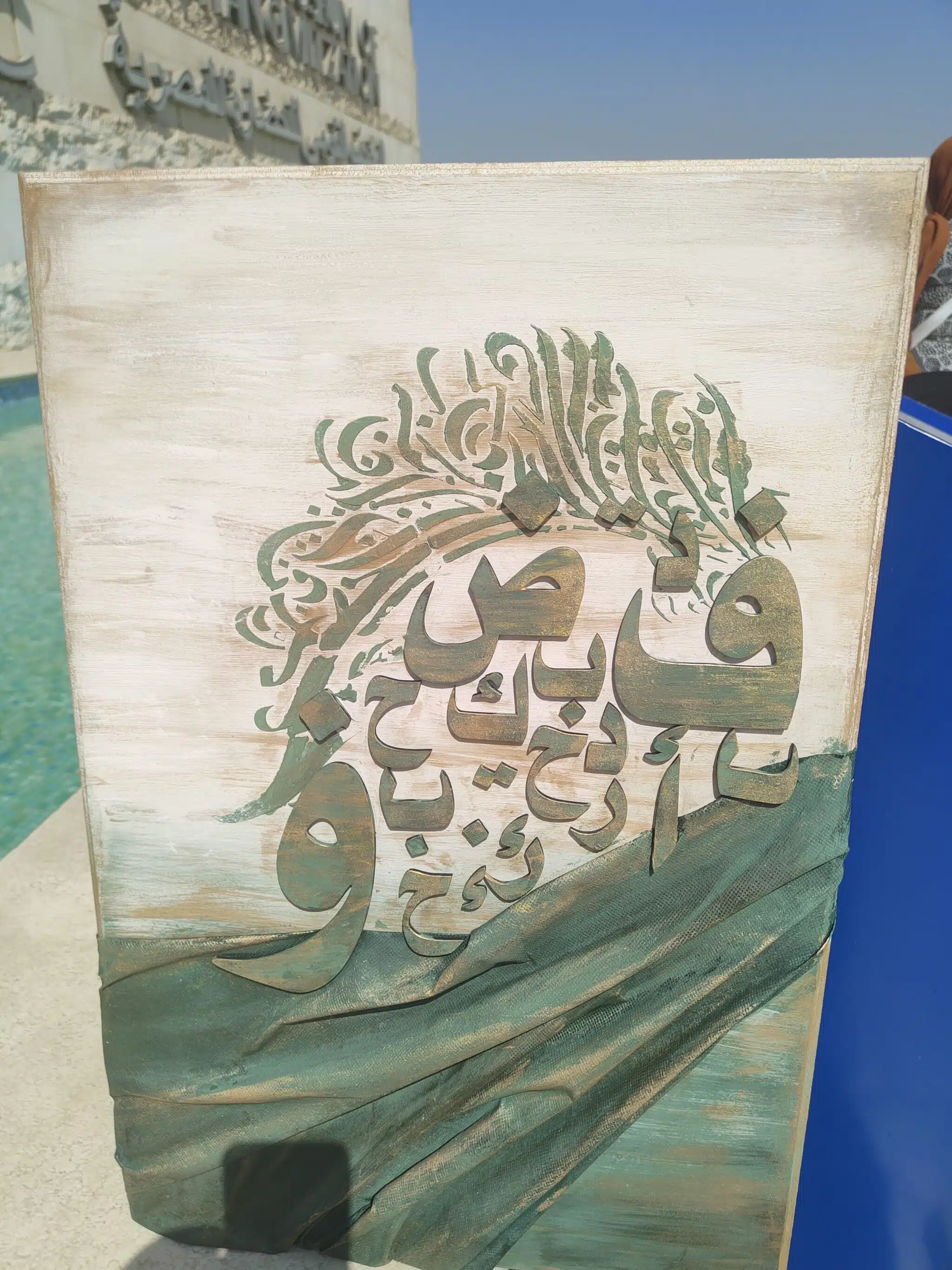 Mixed-media tableau with fabric/wooden arabic letters / texture paste