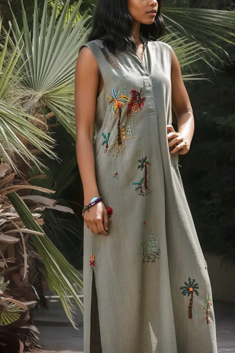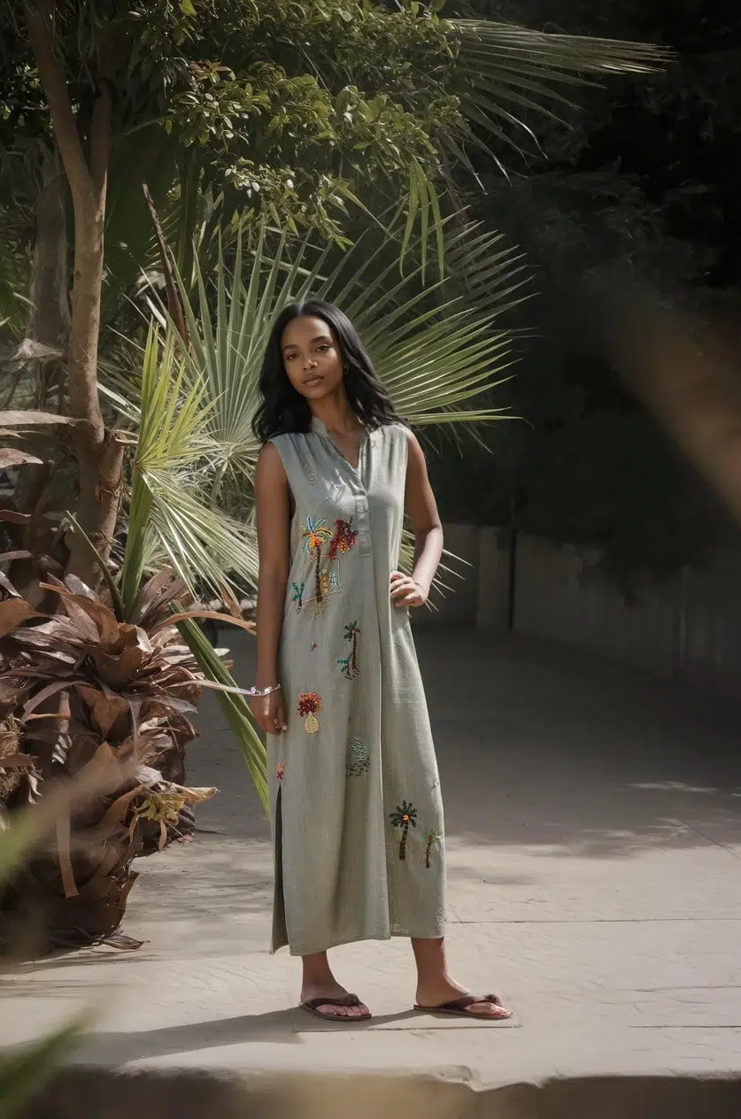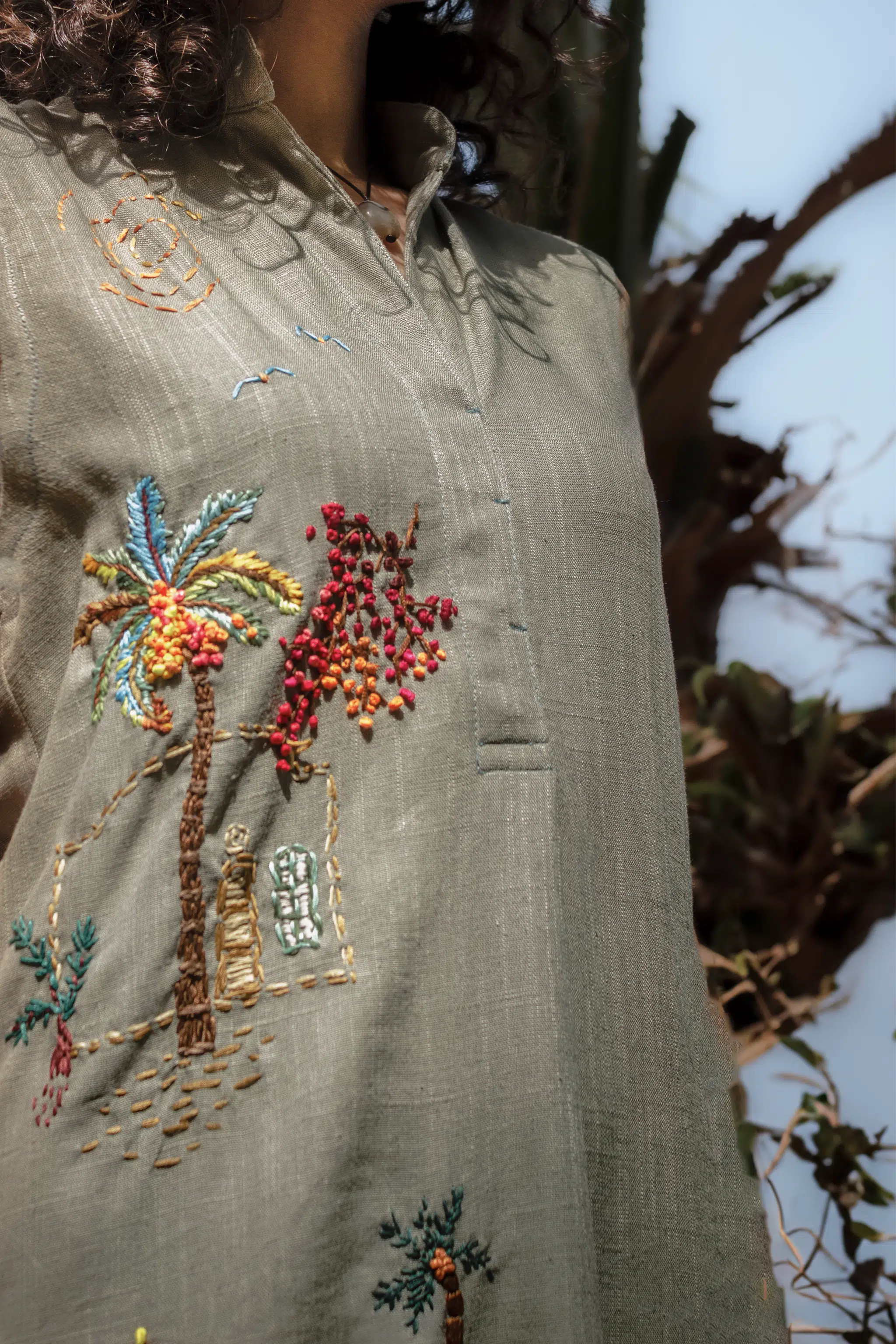 - Cotton linen summer dress hand-embroidered with Egyptian inspired patterns