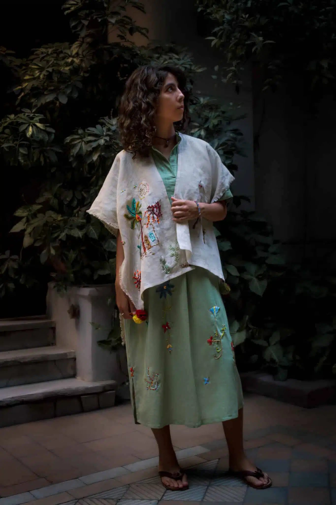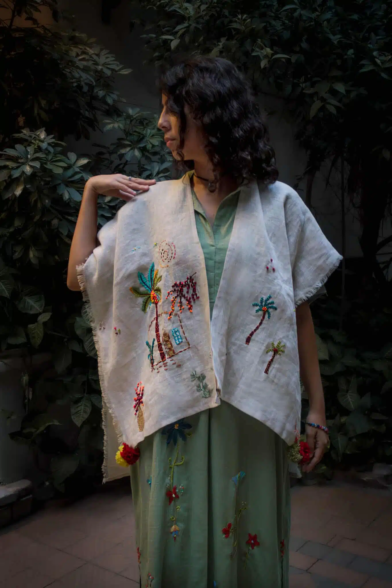 Pure linen beige poncho hand embroidered with our Ardi Design inspired by Egyptian country side.