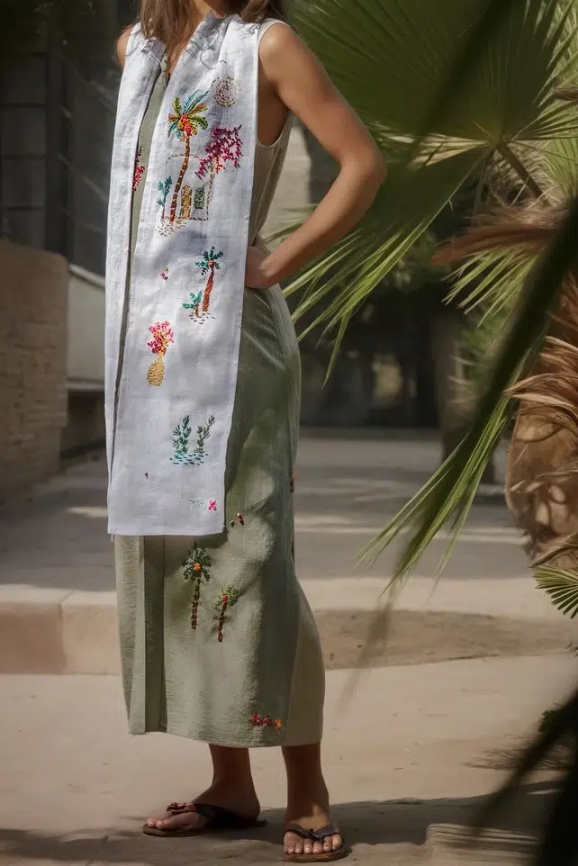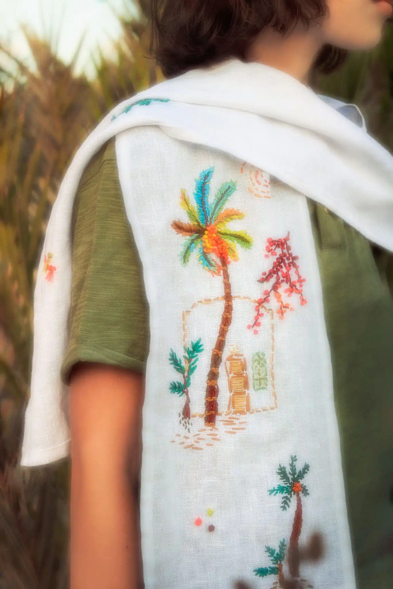 - White pure linen scarf hand0embroidered with Egyptian style countryside in Dahshour
