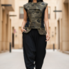 this vest is inspired from victorian age style, upcycled from black and army cotton fabric. designed by Joumana Alhaj ( instagram : @ja_did_