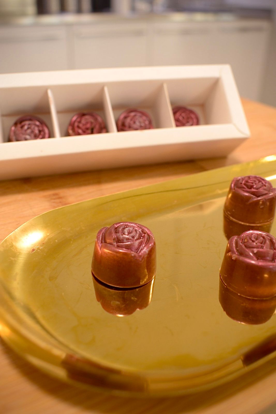 - artisanal hand made milk chocolate bonbon filled with chocolate ganache and redberries 35%