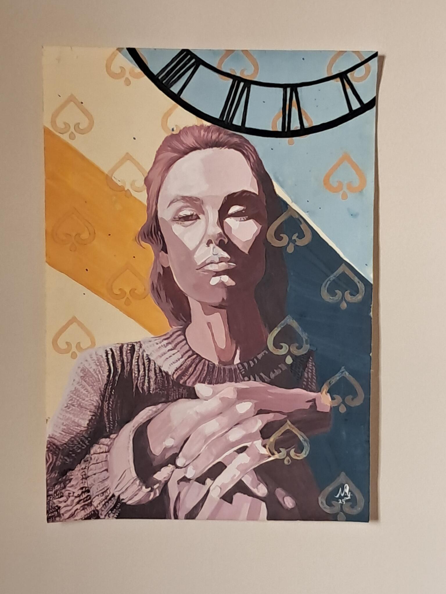 A unique painting made with much love, care and passion, looking for a forever home. A colorful realistic portrait with an ornamented background and details that adds a touch of elegance, style and emotion to your wall. perfect for livingroom, bedroom, reception, or any space that can use a piece that adds glamour and inspires creativity. Each painting conveys deep emotions and carries a piece of the artist’s soul, but most importantly, carries a story waiting to be told only by the viewer.