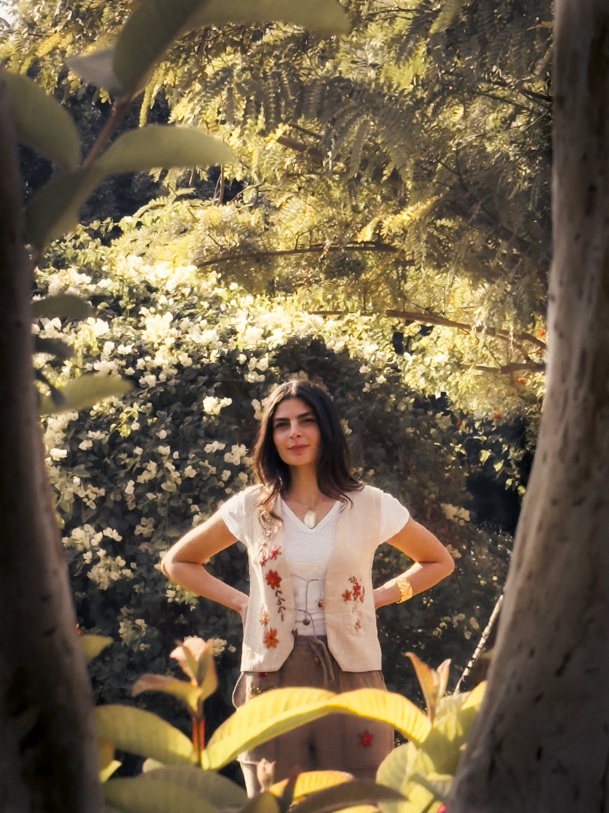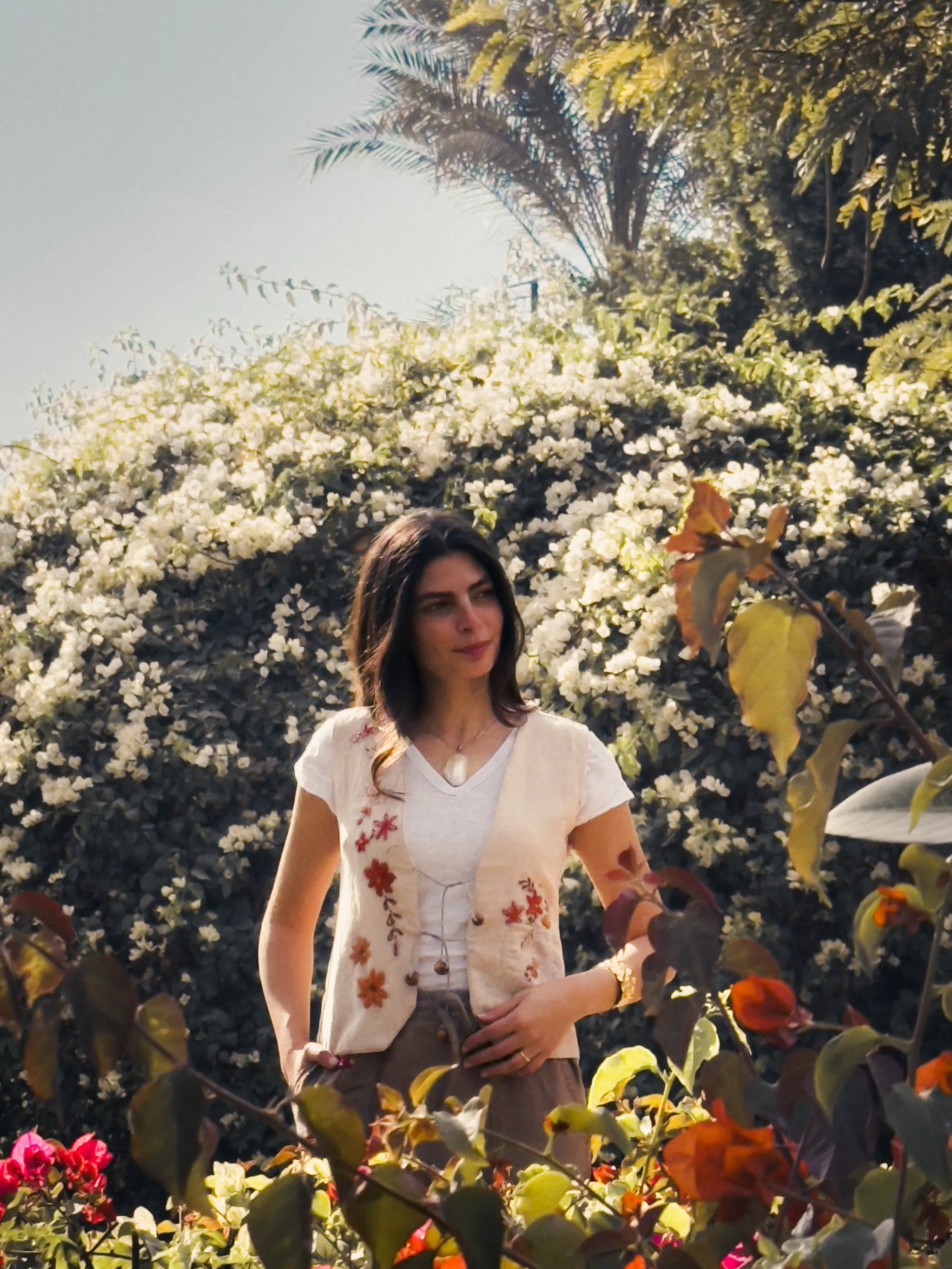 Hand-embroidered floral vest with leather strings and wooden accessories