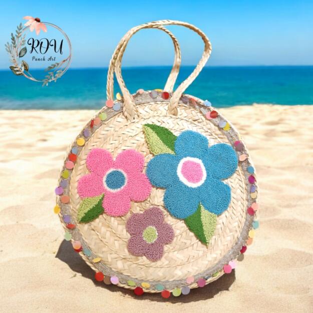 A handcrafted round straw bag adorned with colorful punch-needle florals and playful detailing, inspired by carefree coastal days. Lightweight, charming, and perfect for adding a fresh statement to your summer look.