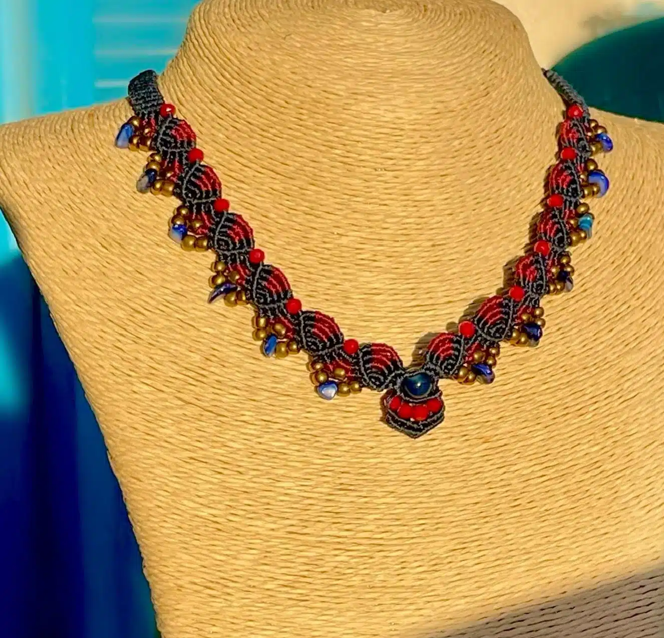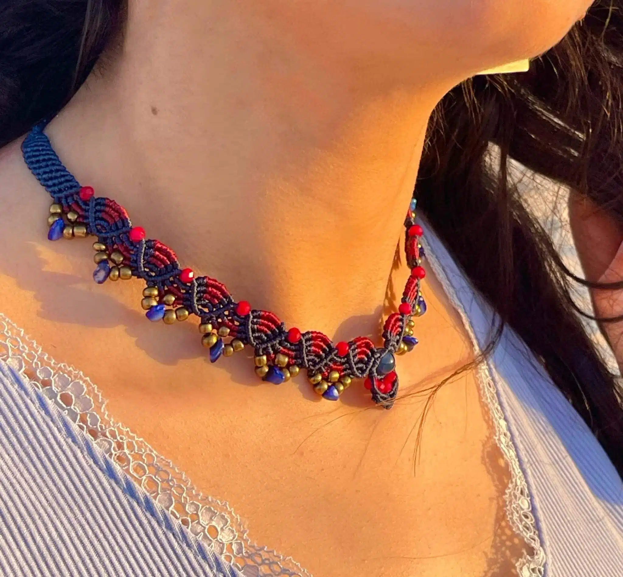 A handmade necklace created by Burgundy and navy cords mixed with brass and Azurite crystal stones.