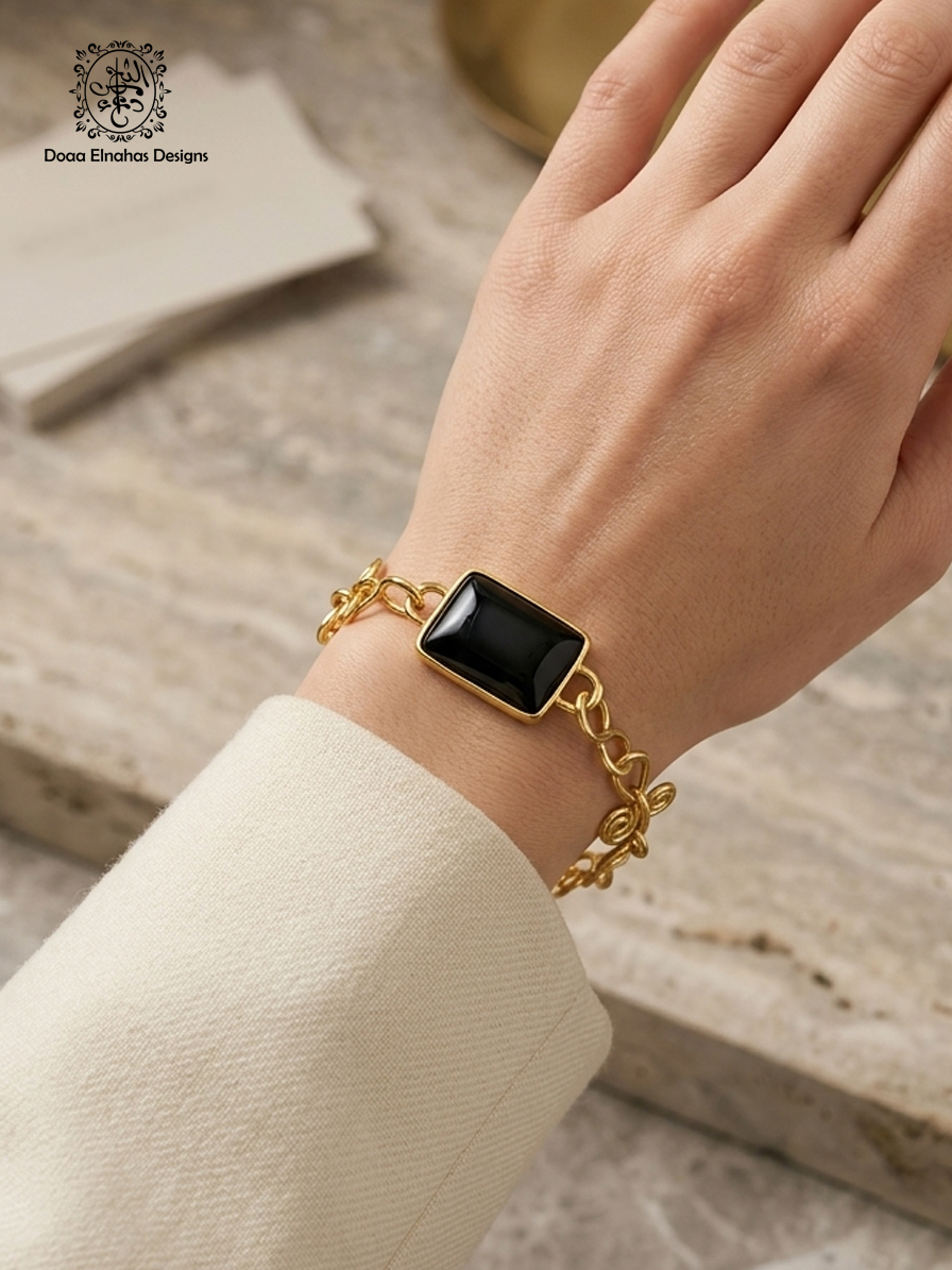 gold plated brass bracelet with onyx stone