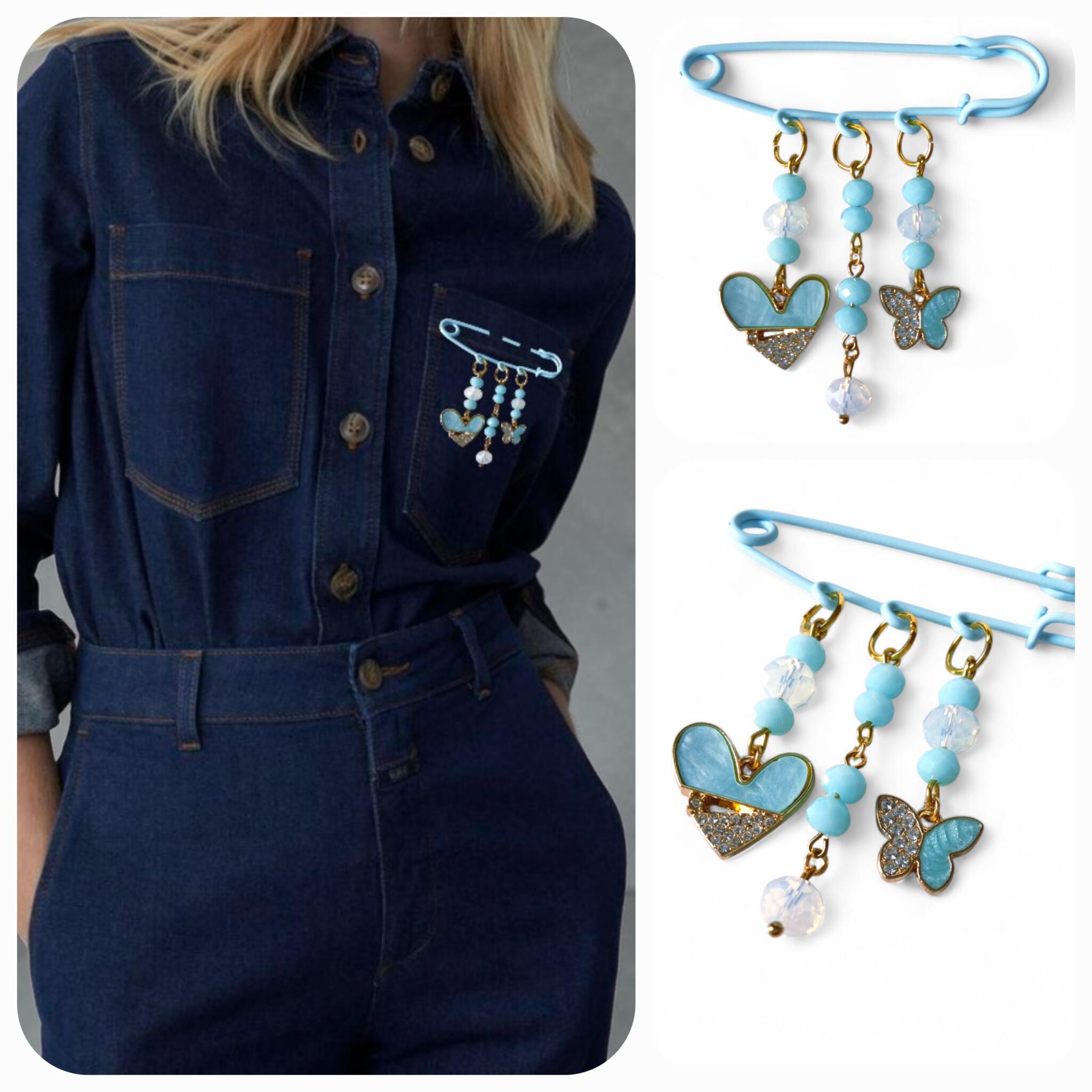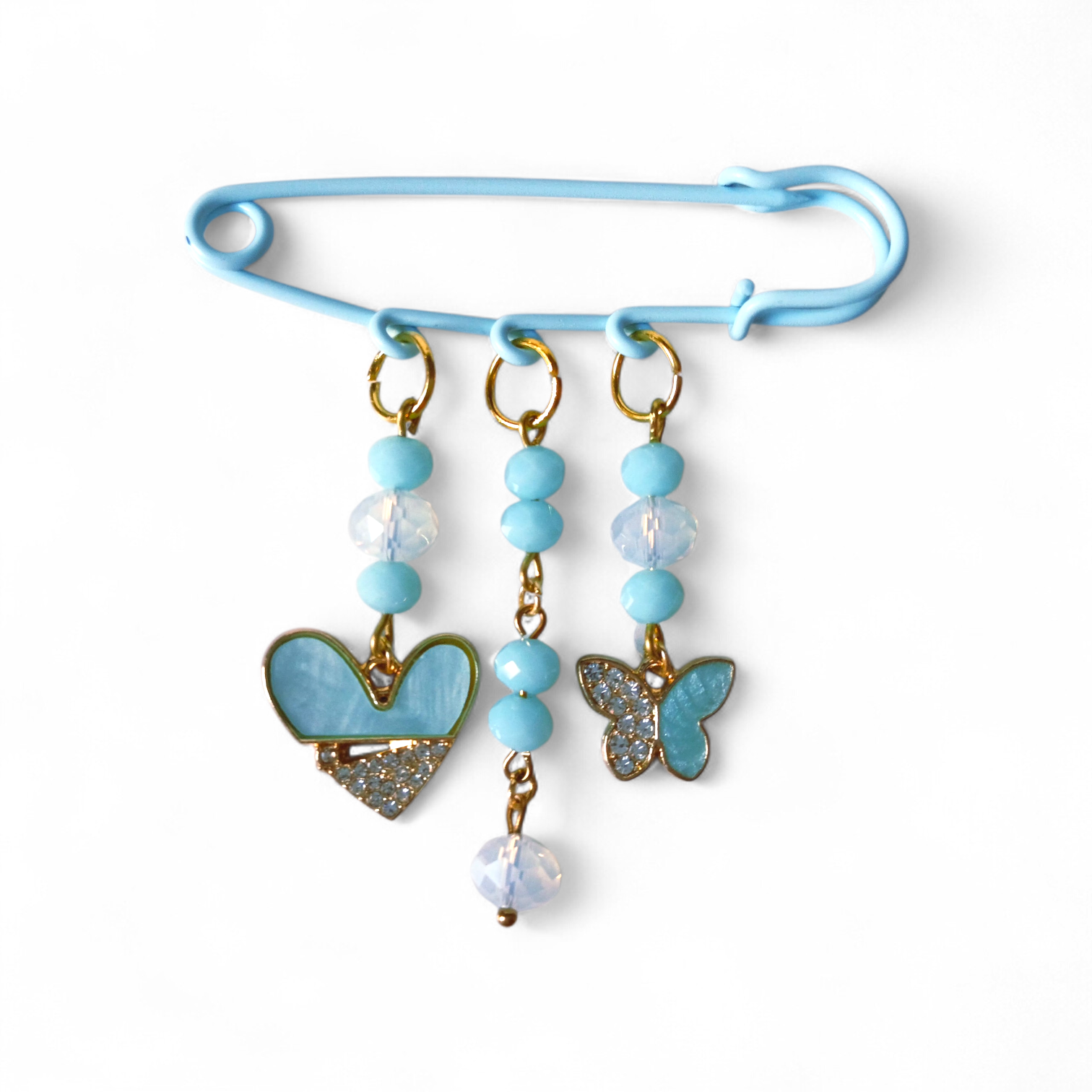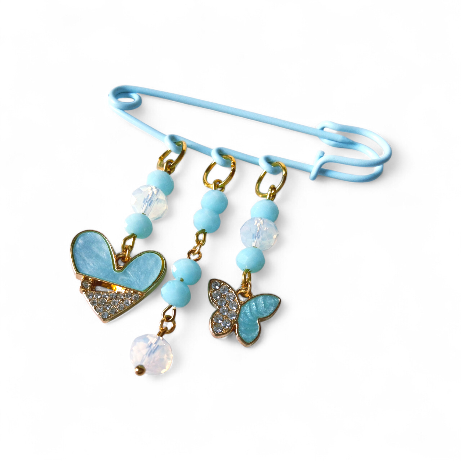 A pin made of baby blue matt crystal and white transparent crystal stone beads with 2 blue pendants in shape of heart and butterfly