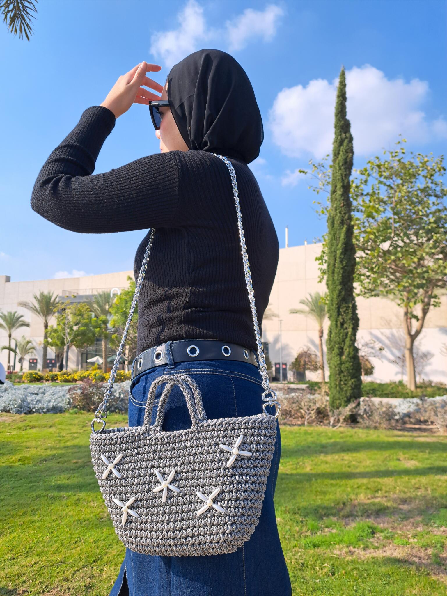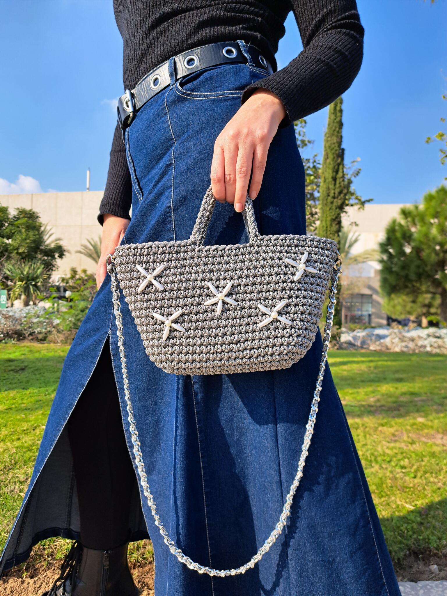 Handmade macrame bags with long metal starp & 2 magnetic locks inside each one. Decorated with pearls.