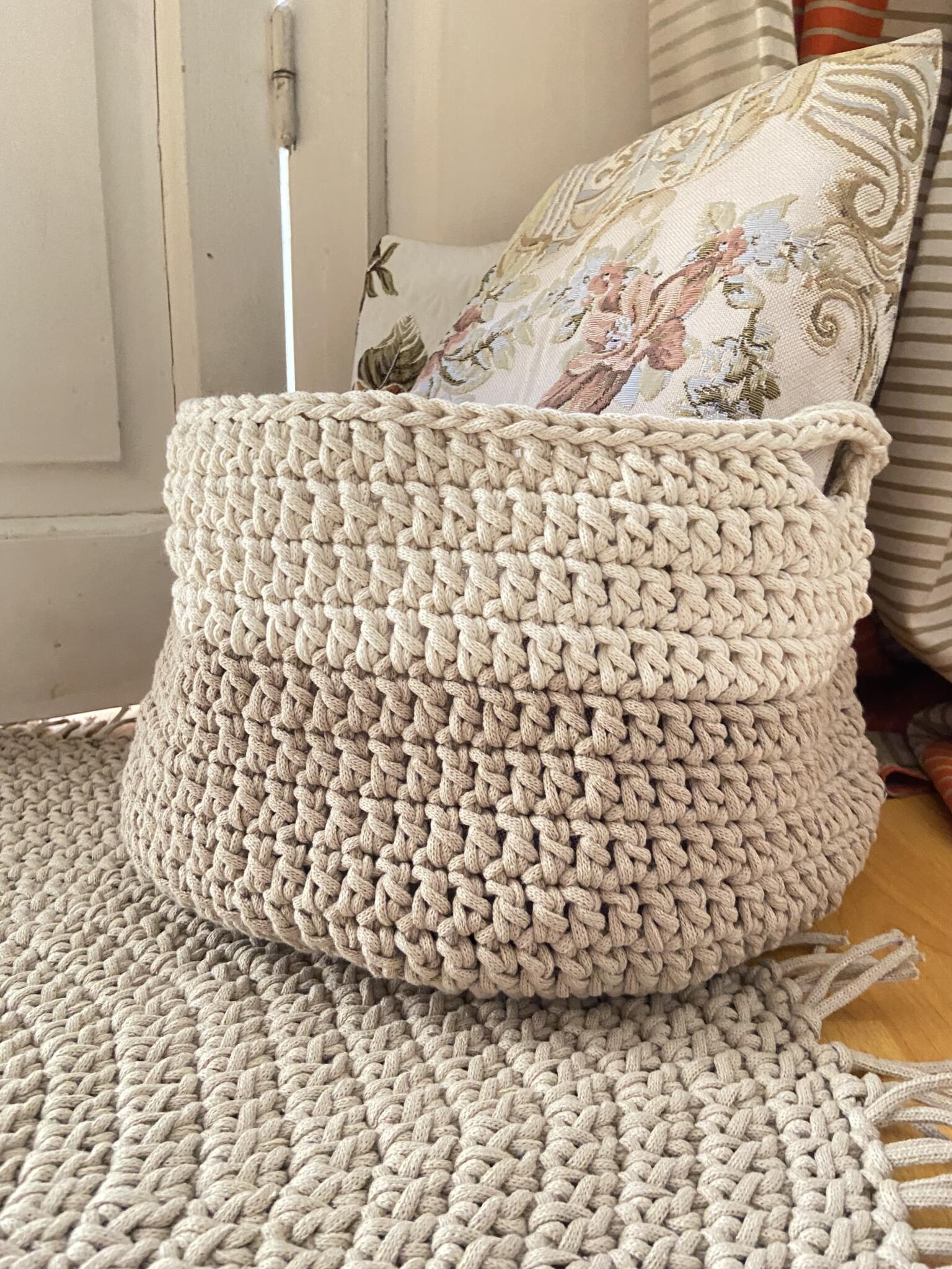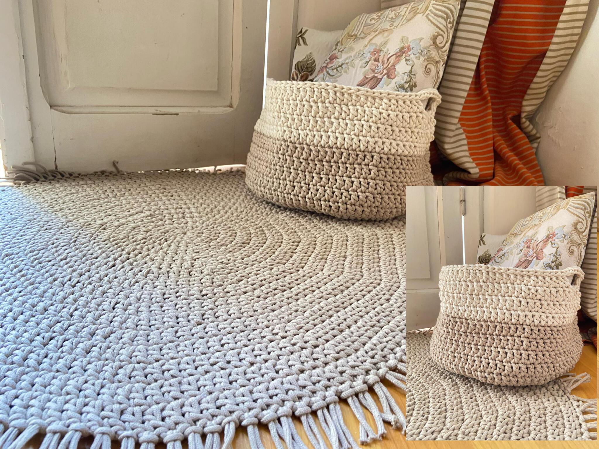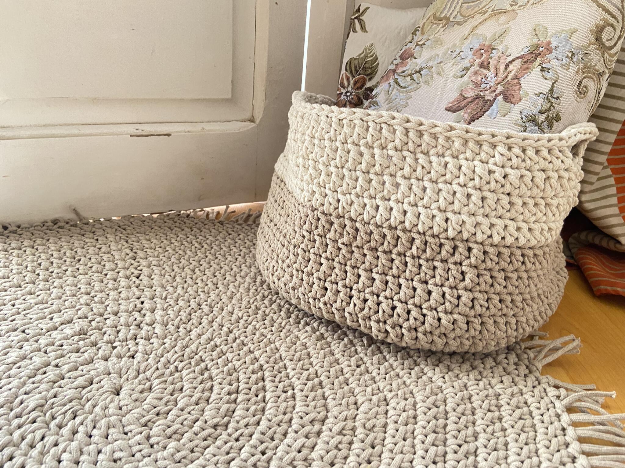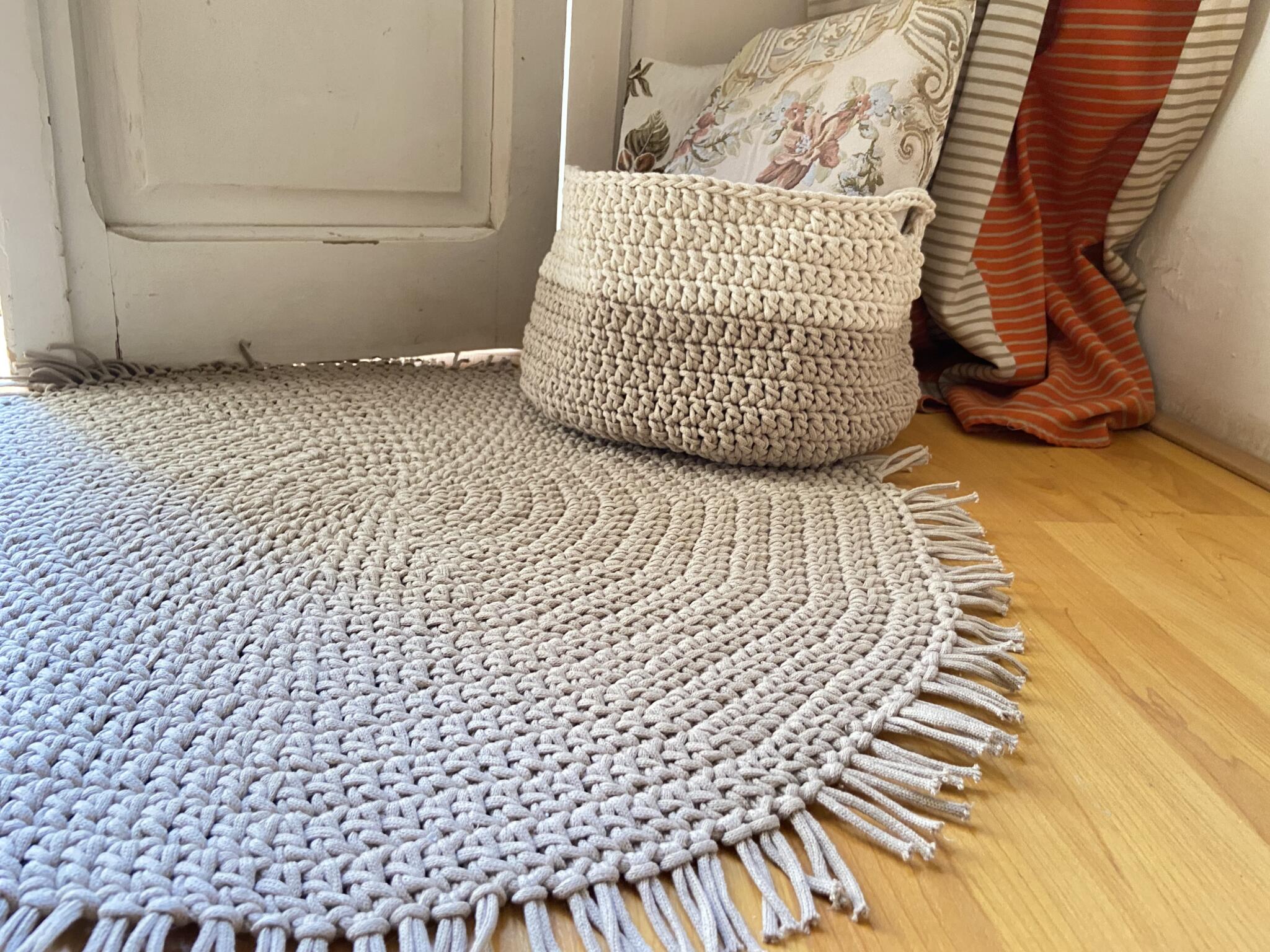 سجادة كروشيه ناعمة بقطر ٩٠ سم، ومعاها بوكس بنفس الخامة واللون، شكلهم يفتح النفس 🤍