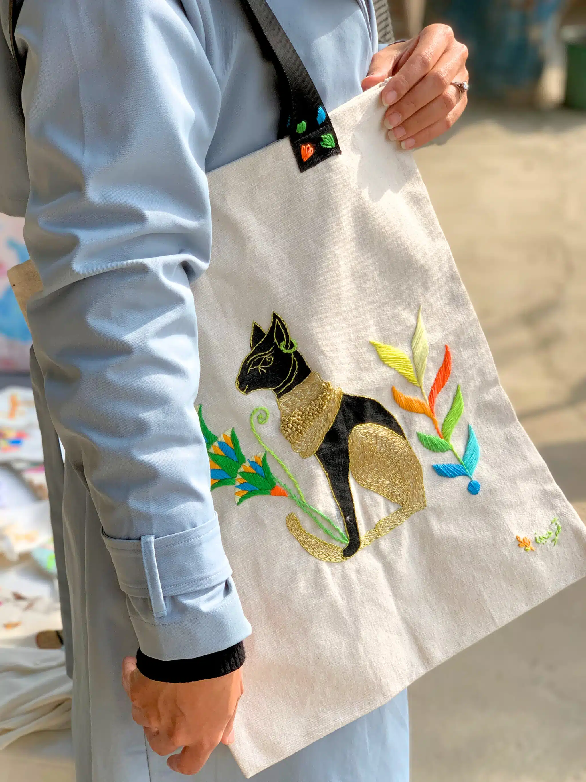 This tote bag is fully hand-painted and hand-embroidered with love, inspired by Bastet, the iconic feline goddess of protection, beauty, and feminine strength.