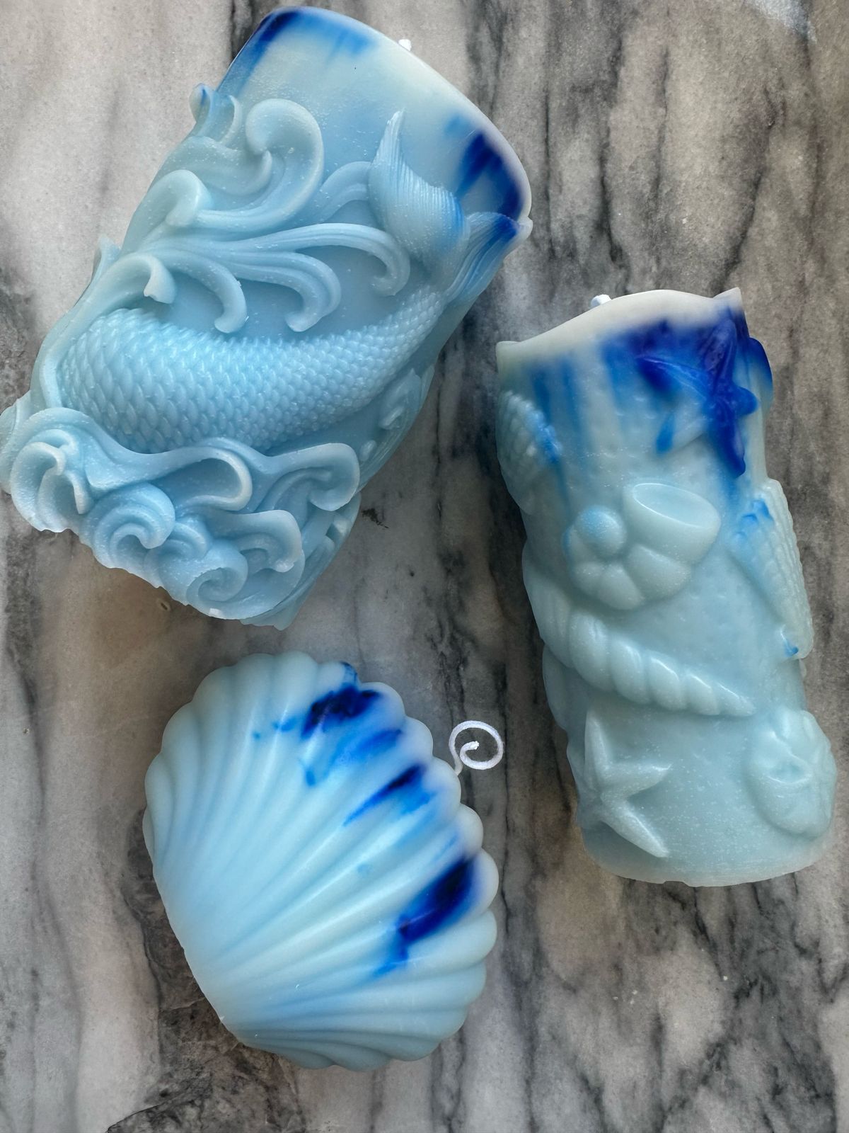 Set of 3 scented candles (Seashell – Mermaid candle and pillar candle).