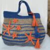 Summer crochet bag made from raffia blue and beige threads with star fish and flowers.