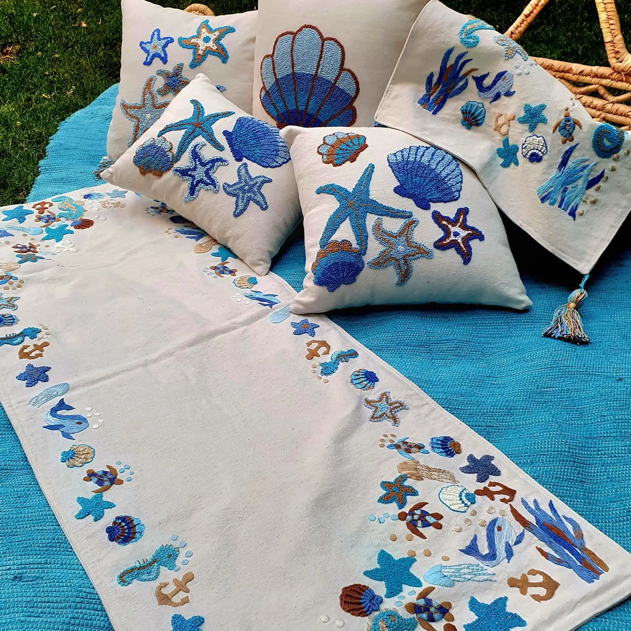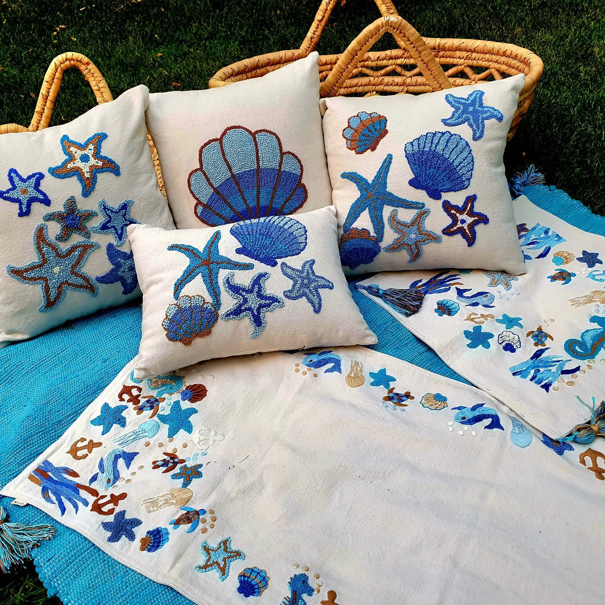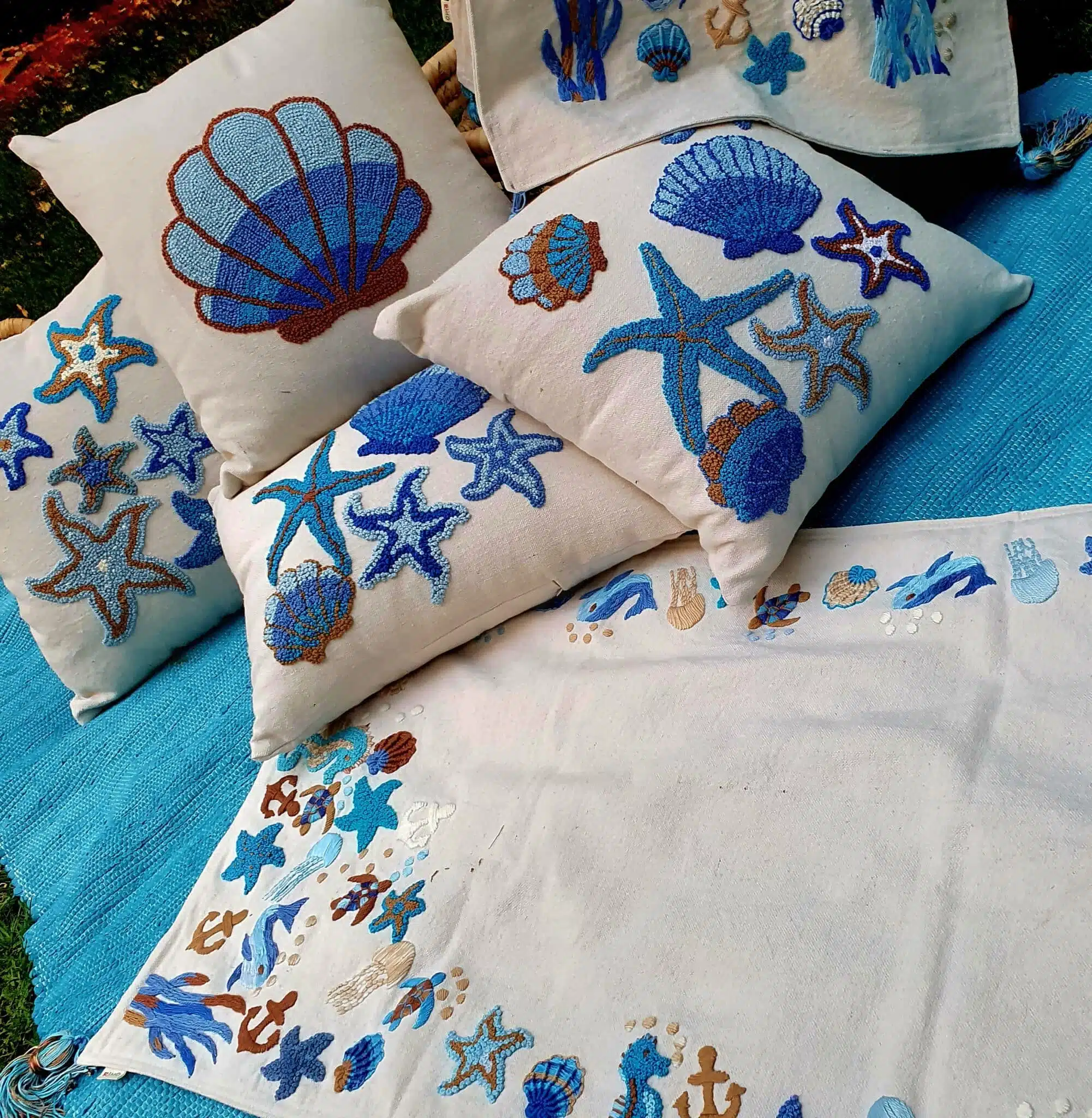 Handmade embroidery cushin with sea icons different shades of blue 💙
