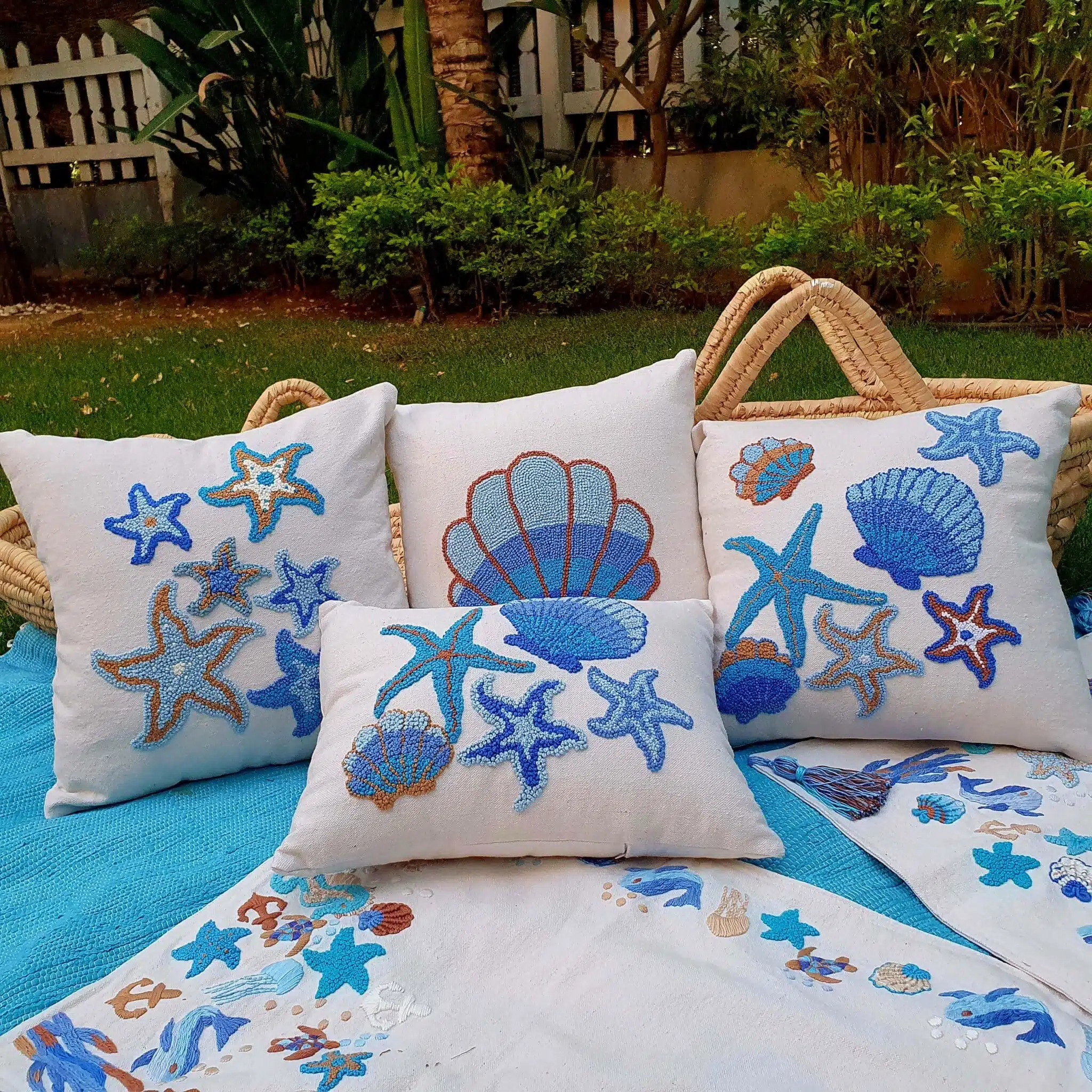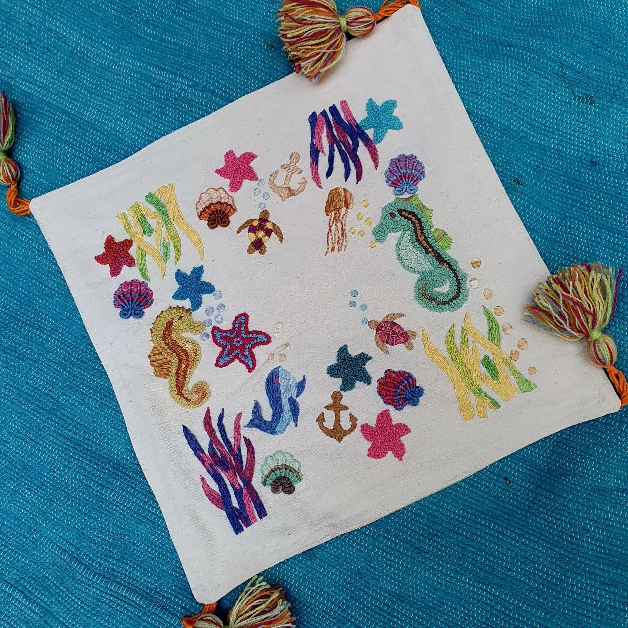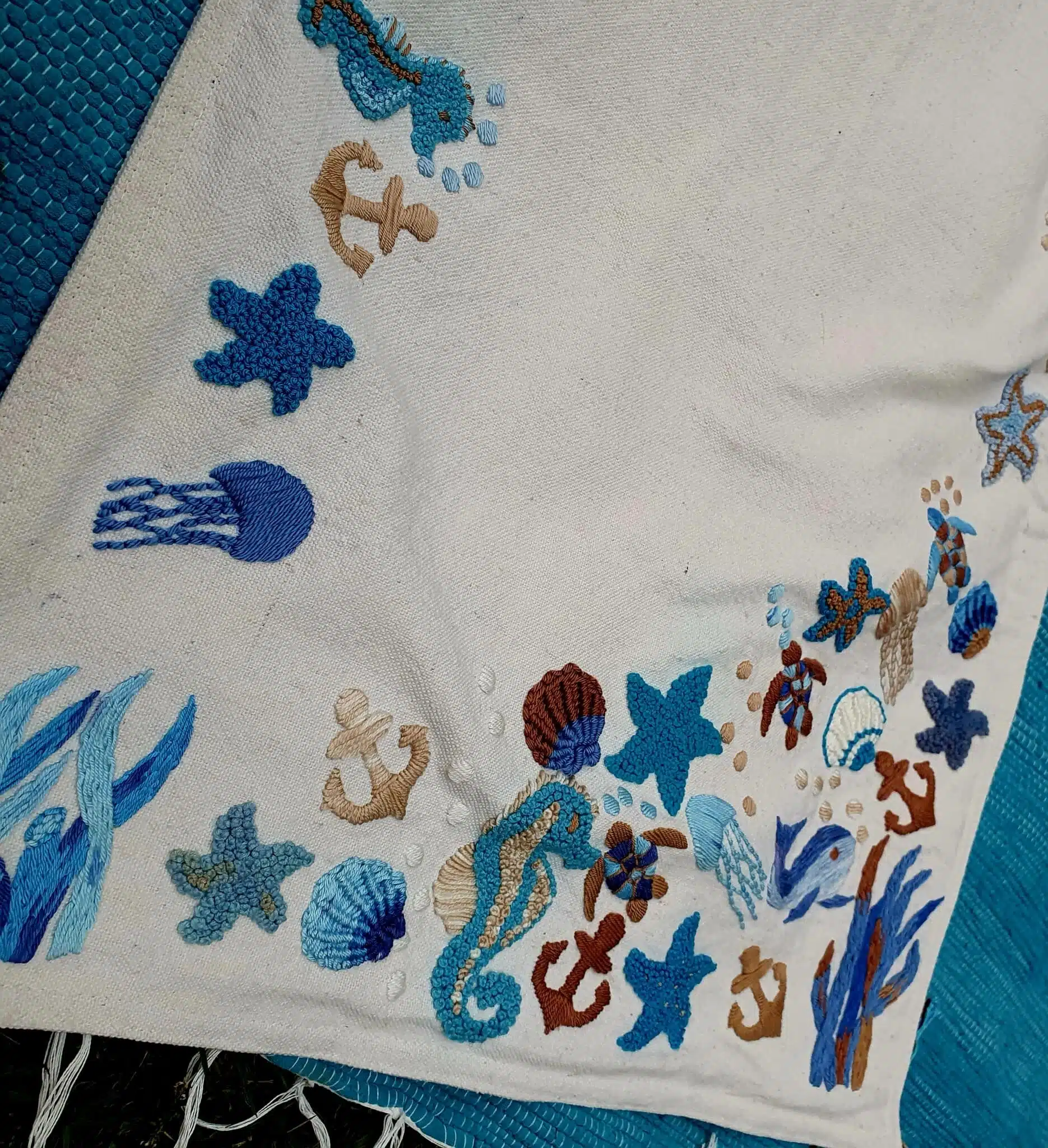 Handmade embroidery cushin with sea icons different shades of blue 💙