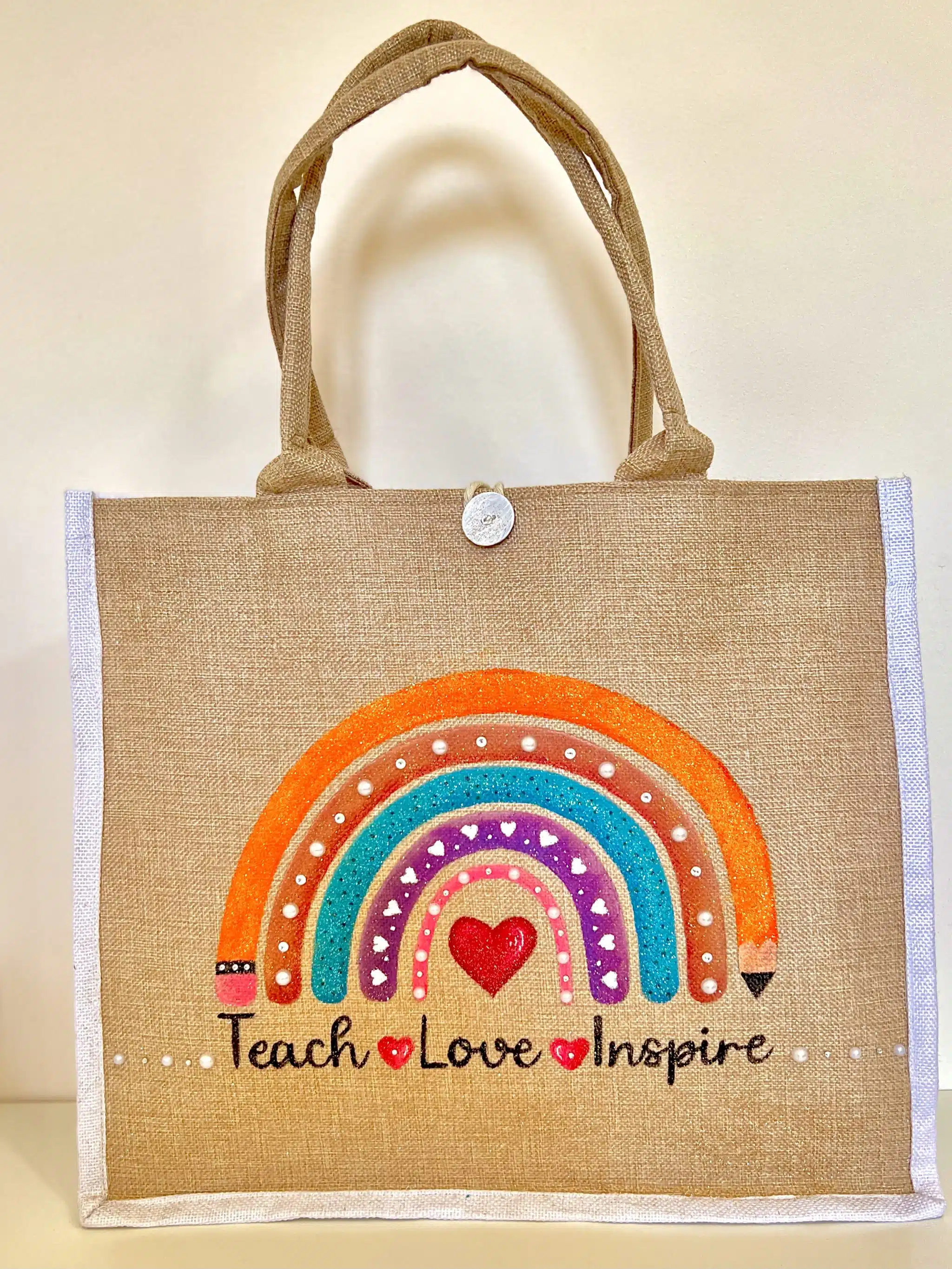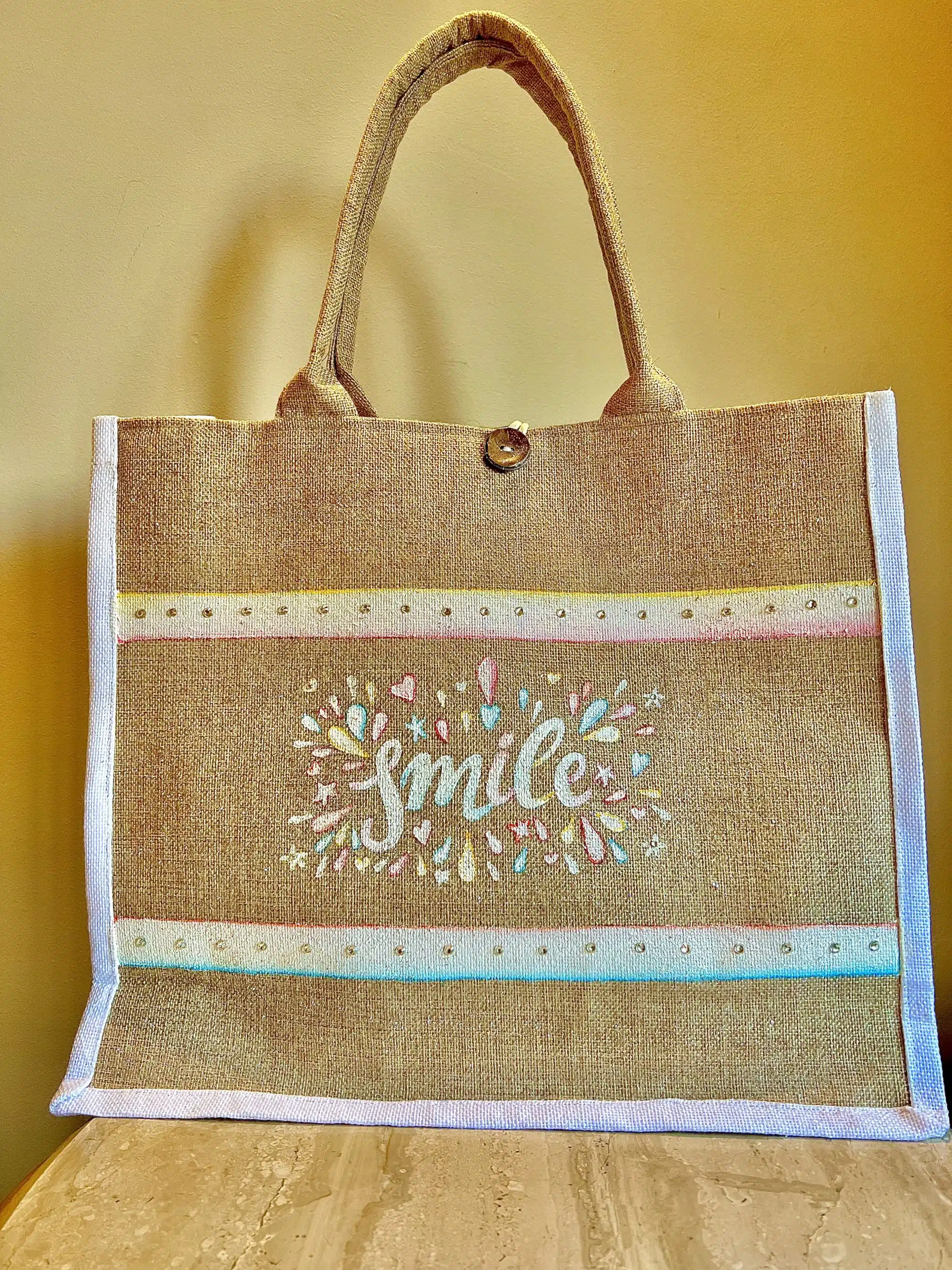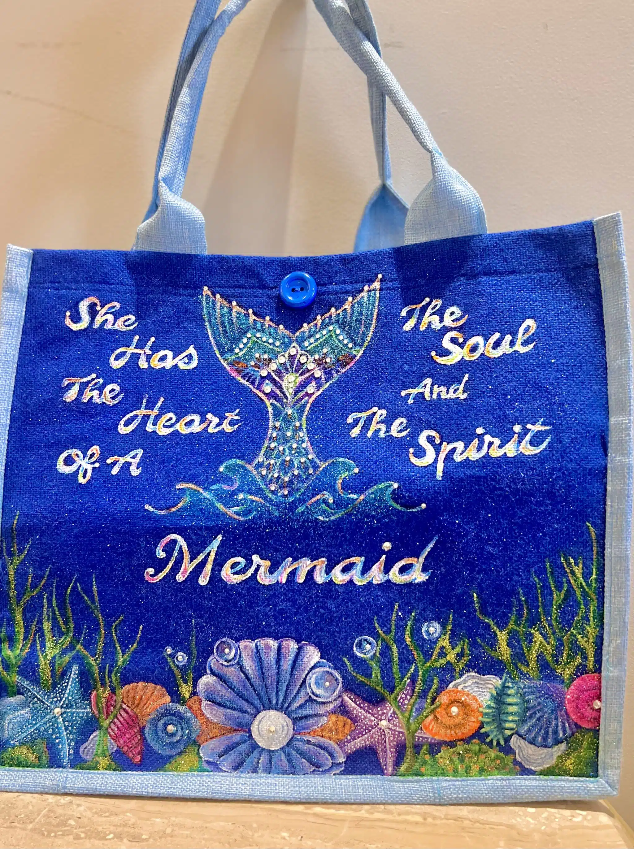 A beautifully hand-painted tote featuring an inspiring message: “Don’t let anyone ever dull your sparkle.” Designed with shimmering details, a deep blue celestial background, and oceanic motifs, this bag radiates positivity and confidence. Perfect for those who love the sea and embrace their unique shine.