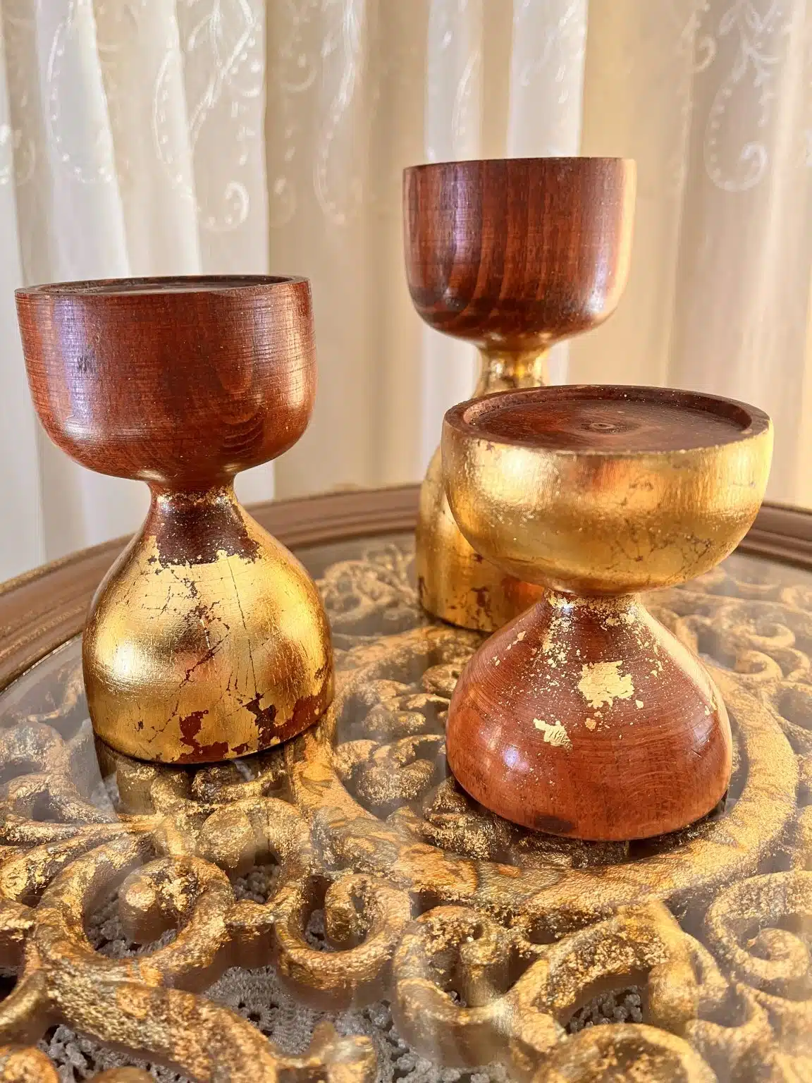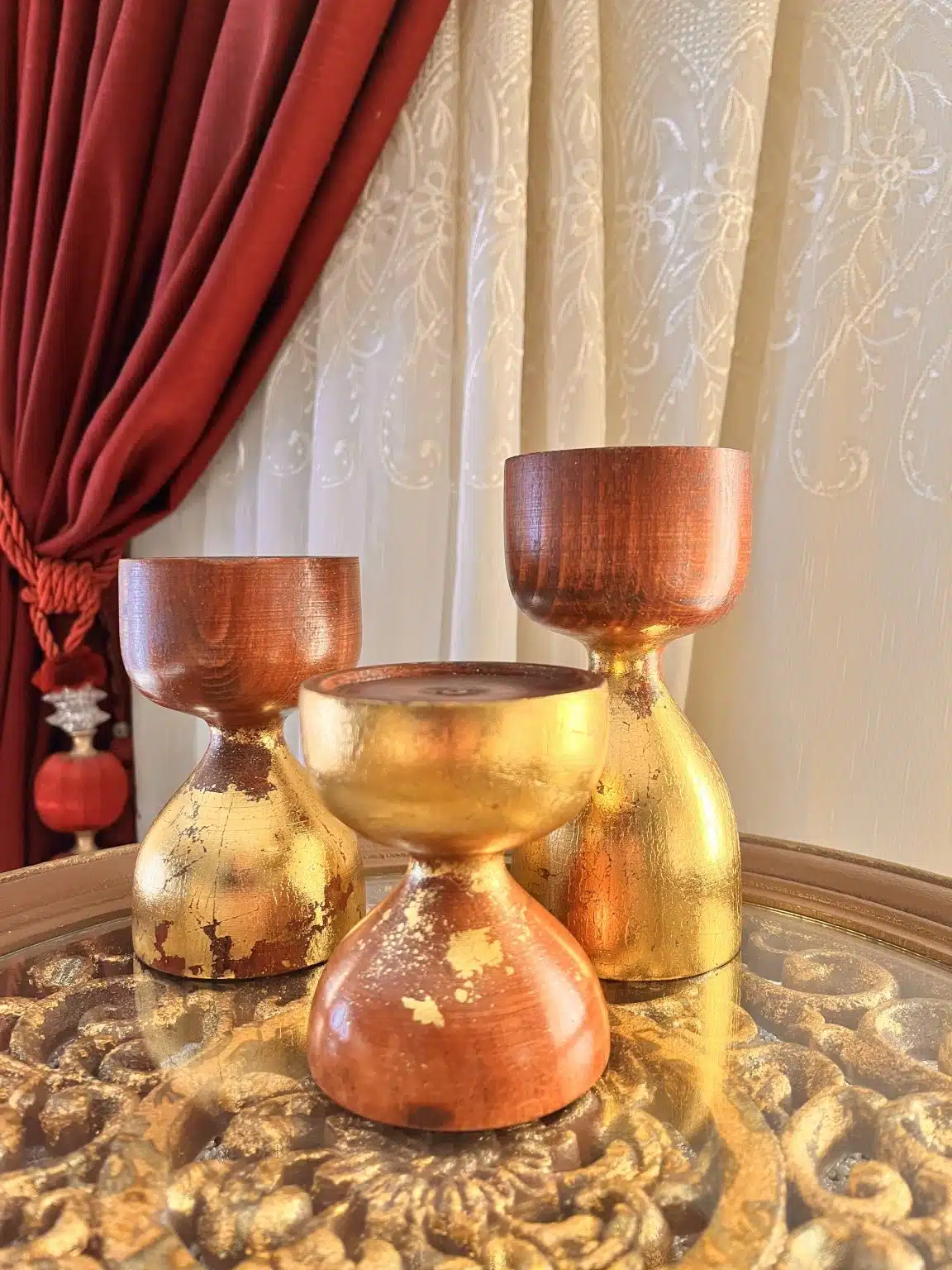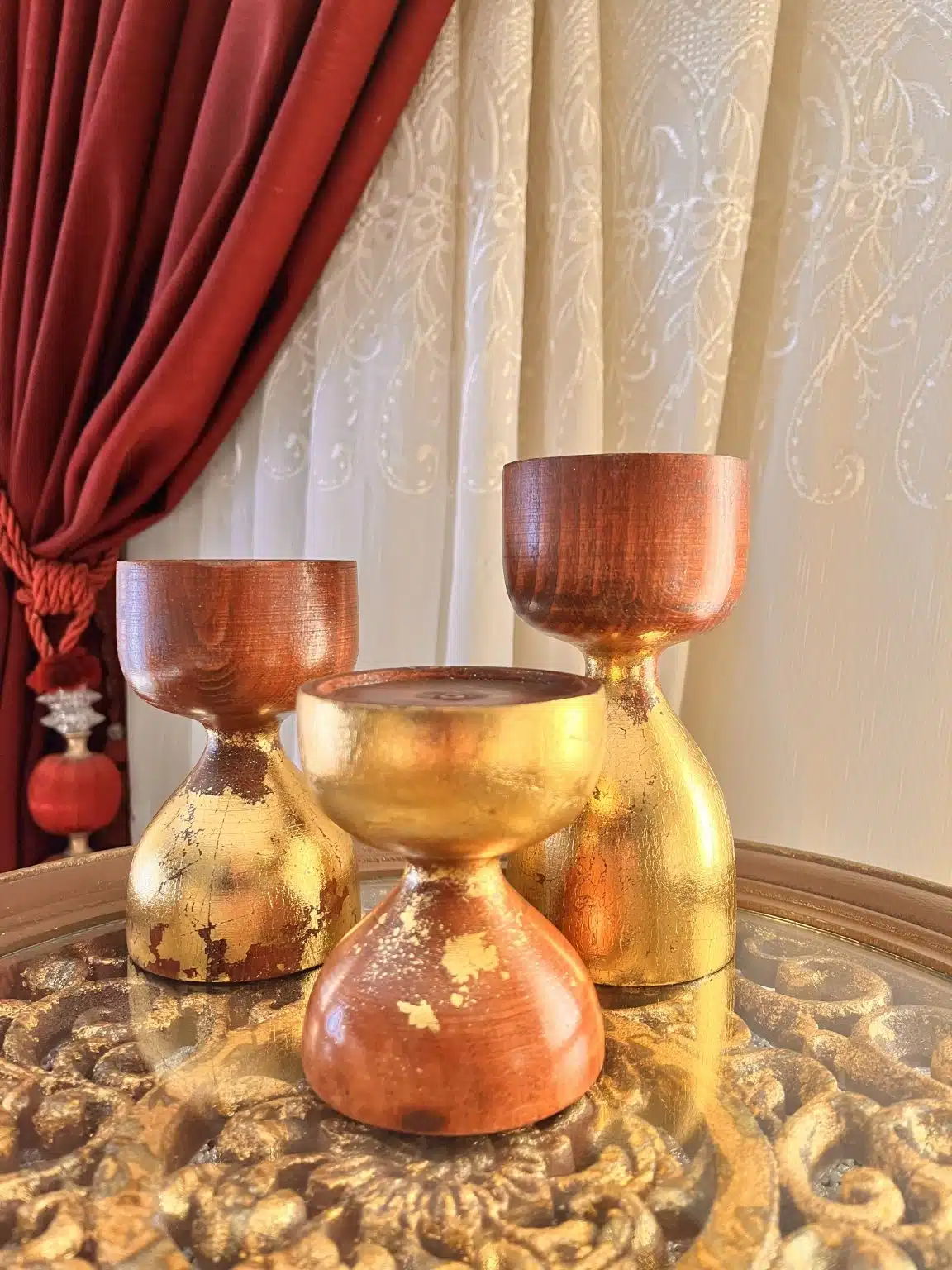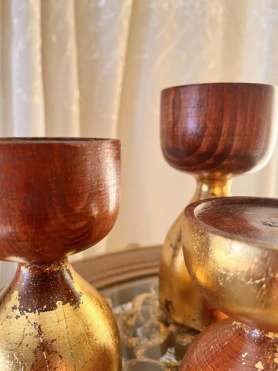 Beech Wood Candle Holder set of 3 polished with wood stain and cracked gold leaves