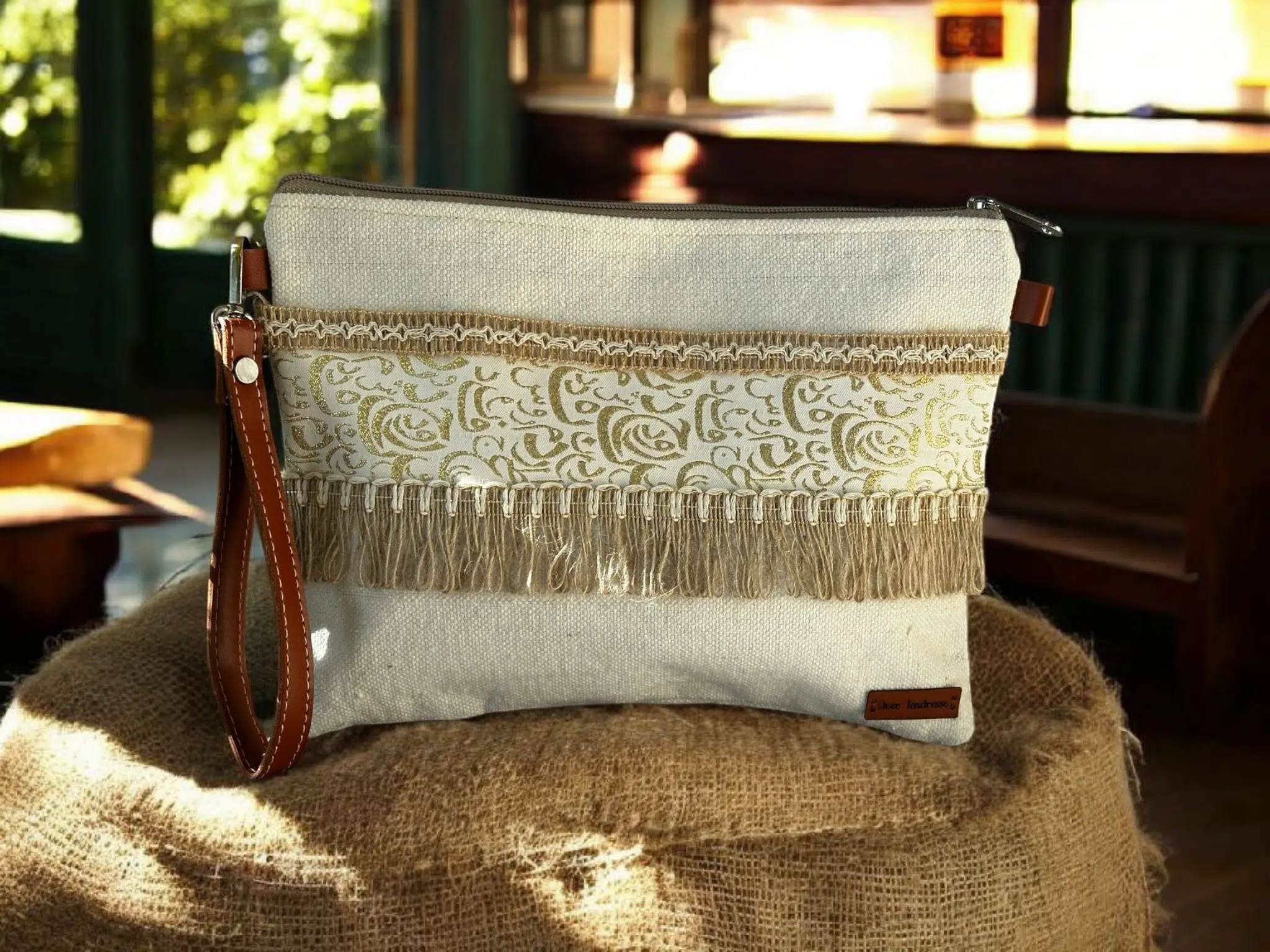 Beige clutch with arabic calligraphy and burlap fringes. Suitable for ramadan outings and as ramadan gifts.