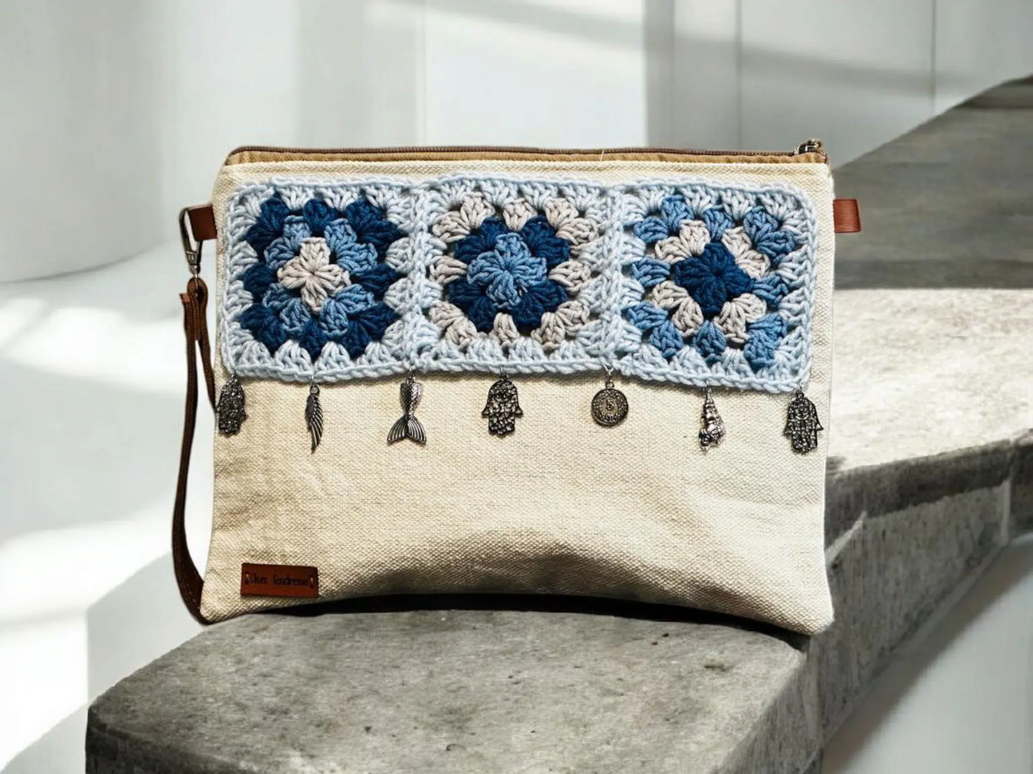 Beige clutch with lovely granny squares made with different shades of blue.notice the cute silver charms attached to the granny squares. Suitable for ramadan outings and gifts