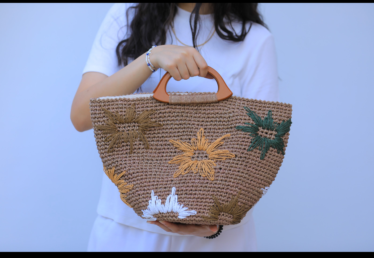 Beige flowers raffia bag with a wooden handle ,, made from raffia threads .