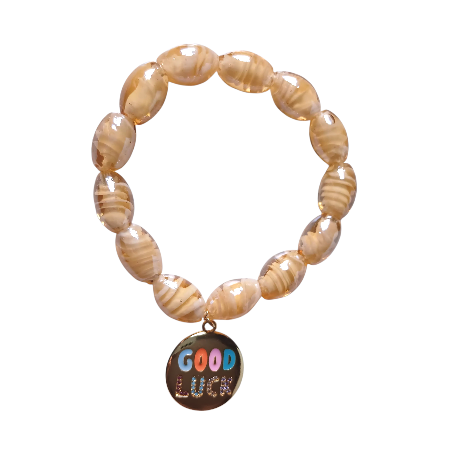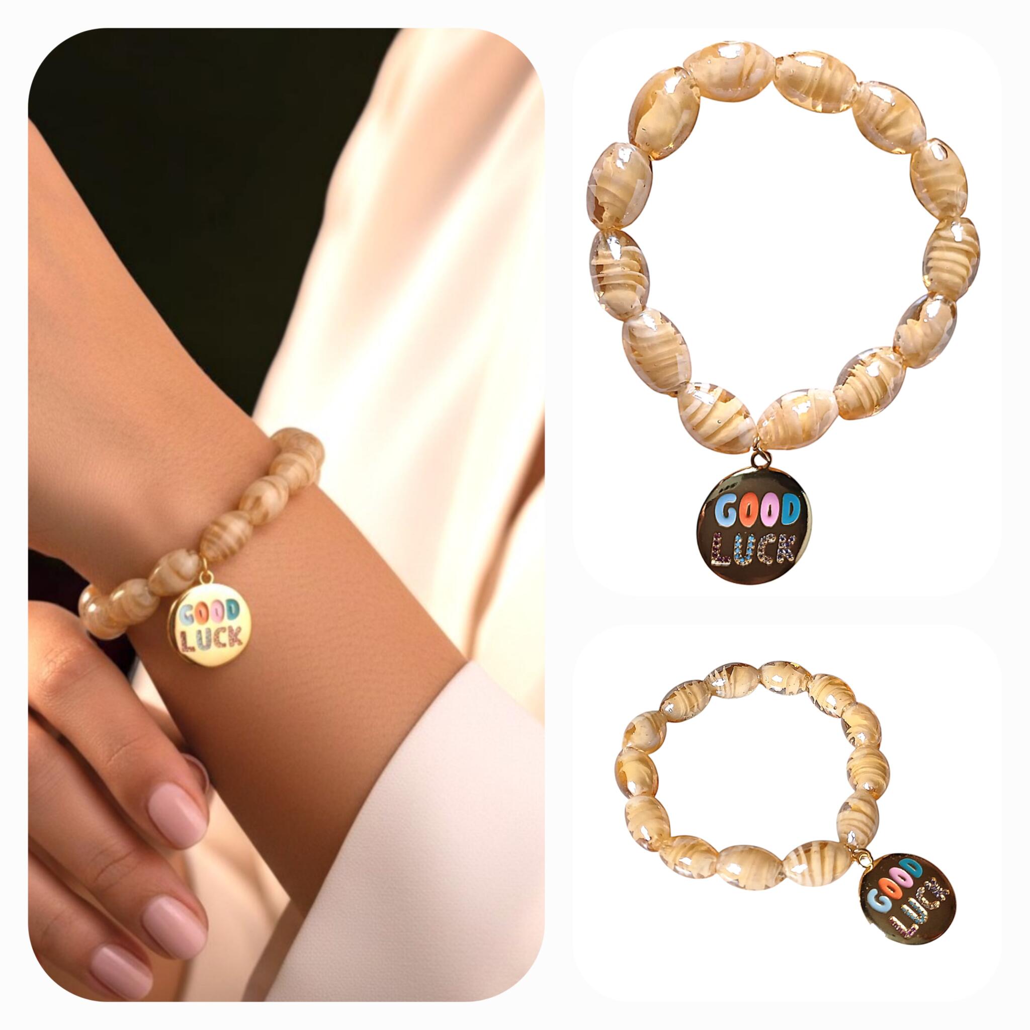 A bracelet made of beige murano glass beads in oval shape with a round golden pendant with the word “Good Luck”