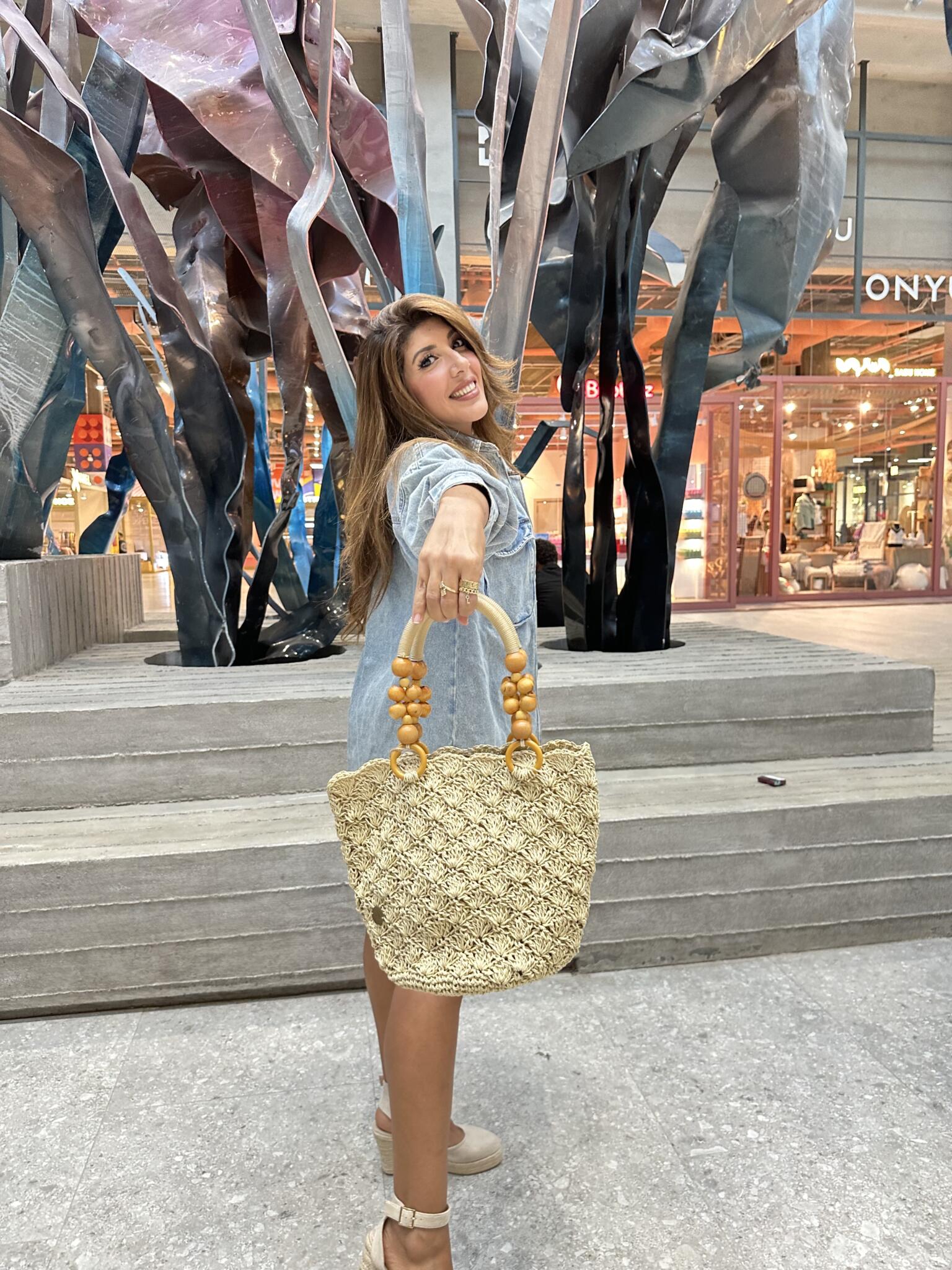 Beige Raffia Bag made from raffia threads with a wooden pompom handle