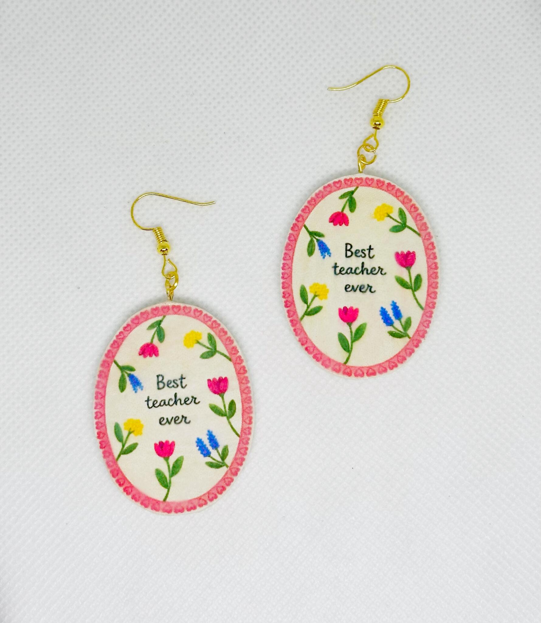 Handmade “Best Teacher Ever” earrings, a lovely gift to appreciate teachers on Mother’s Day.