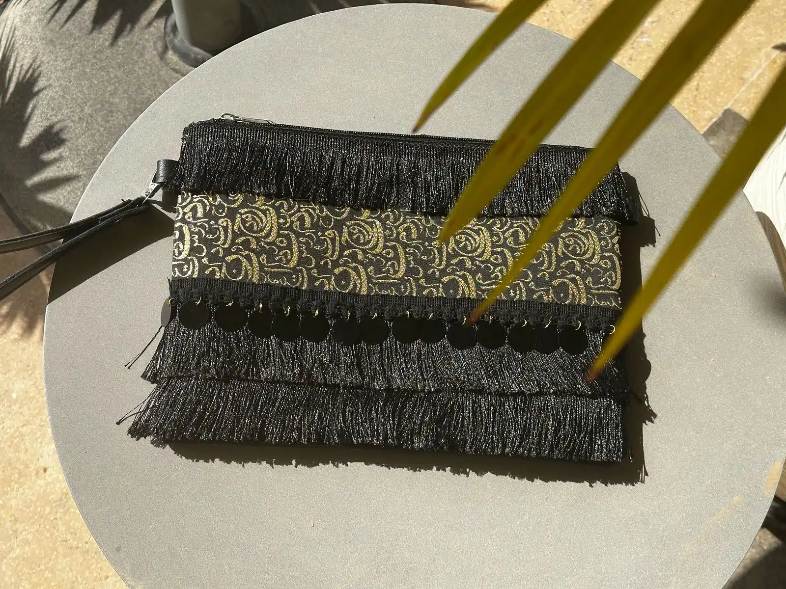 Large sturdy black clutch 22*30 cm made with high quality linen fabric, and leather back. With a catchy golden calligraphy and layered black fringes. Notice the lovely large black sequin. Spacious with inside pocket .