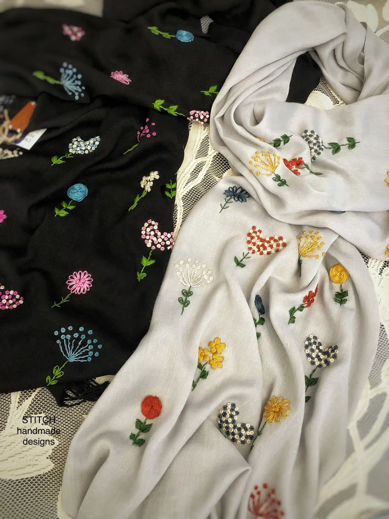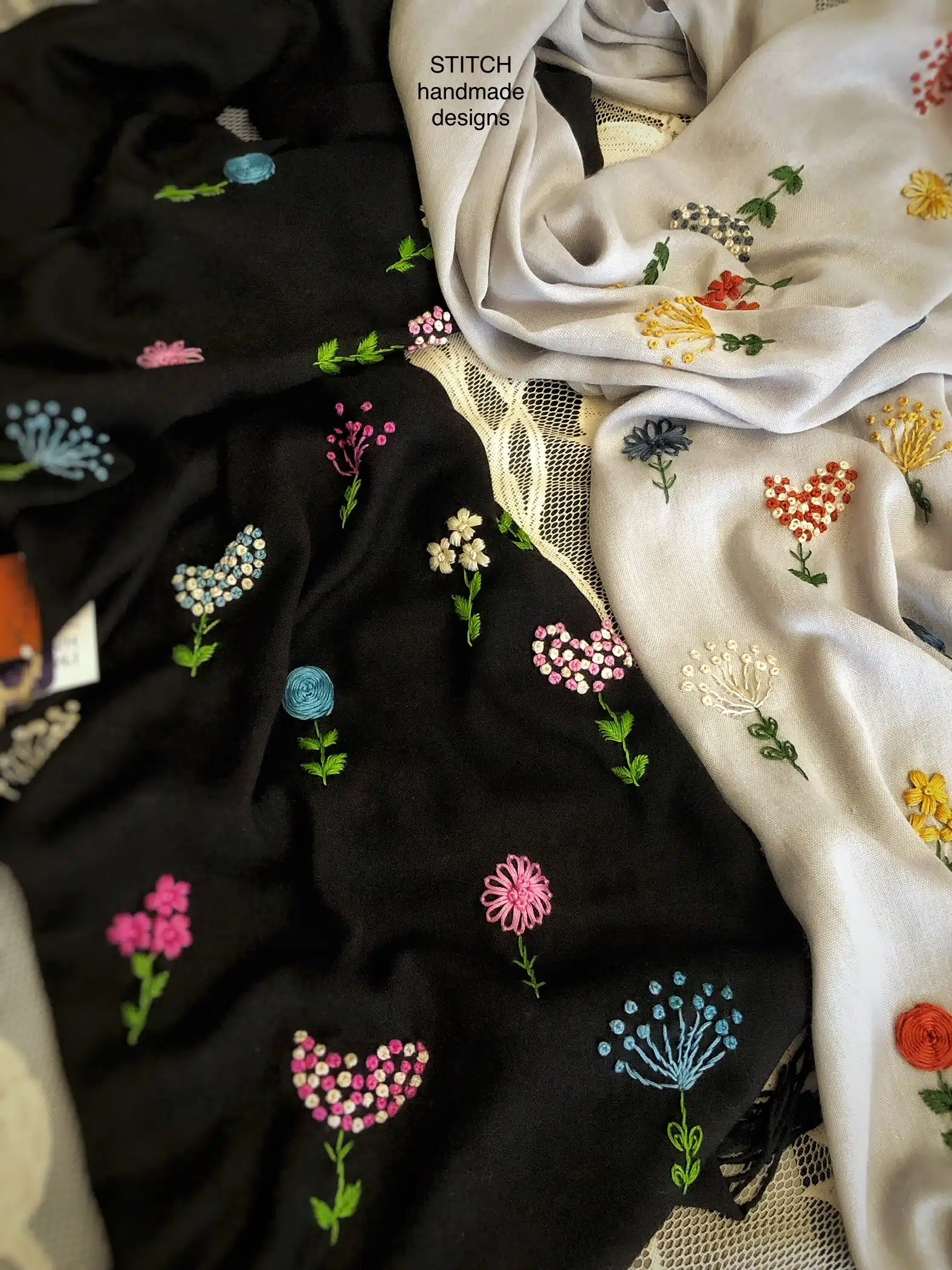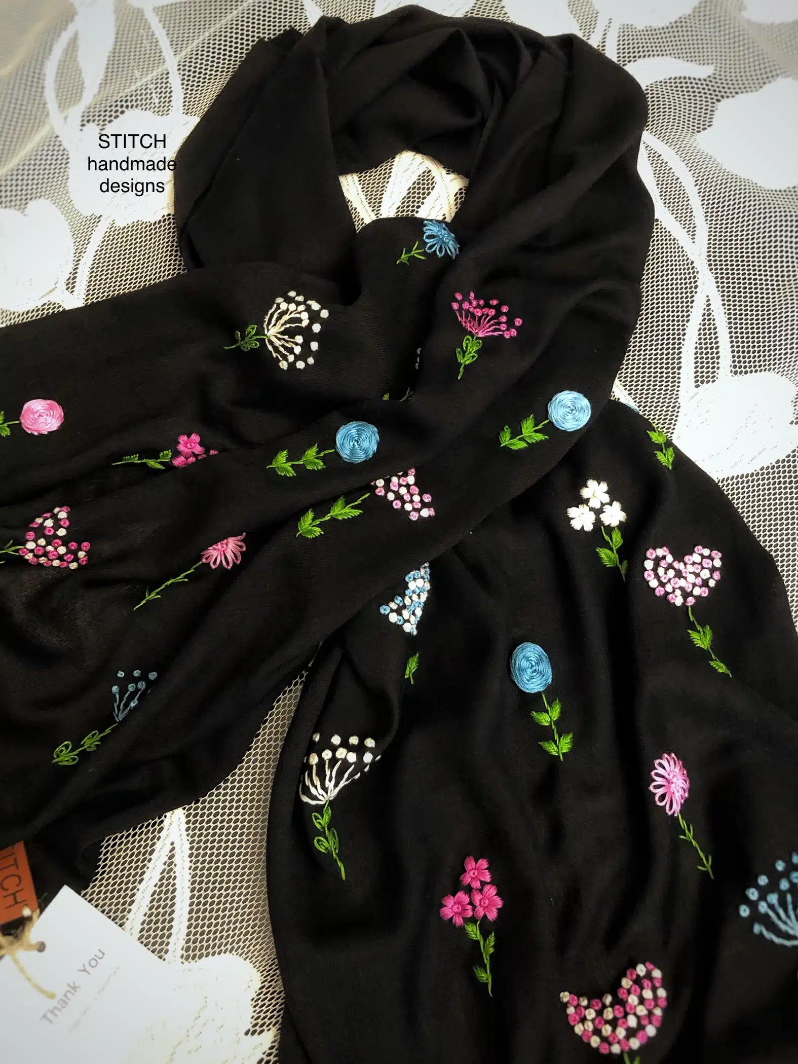 This product name emphasizes the vividness of the flowers on the black scarf. It suggests a sense of playfulness and joy, while still maintaining the elegance of a hand-embroidered pashmina shawl.