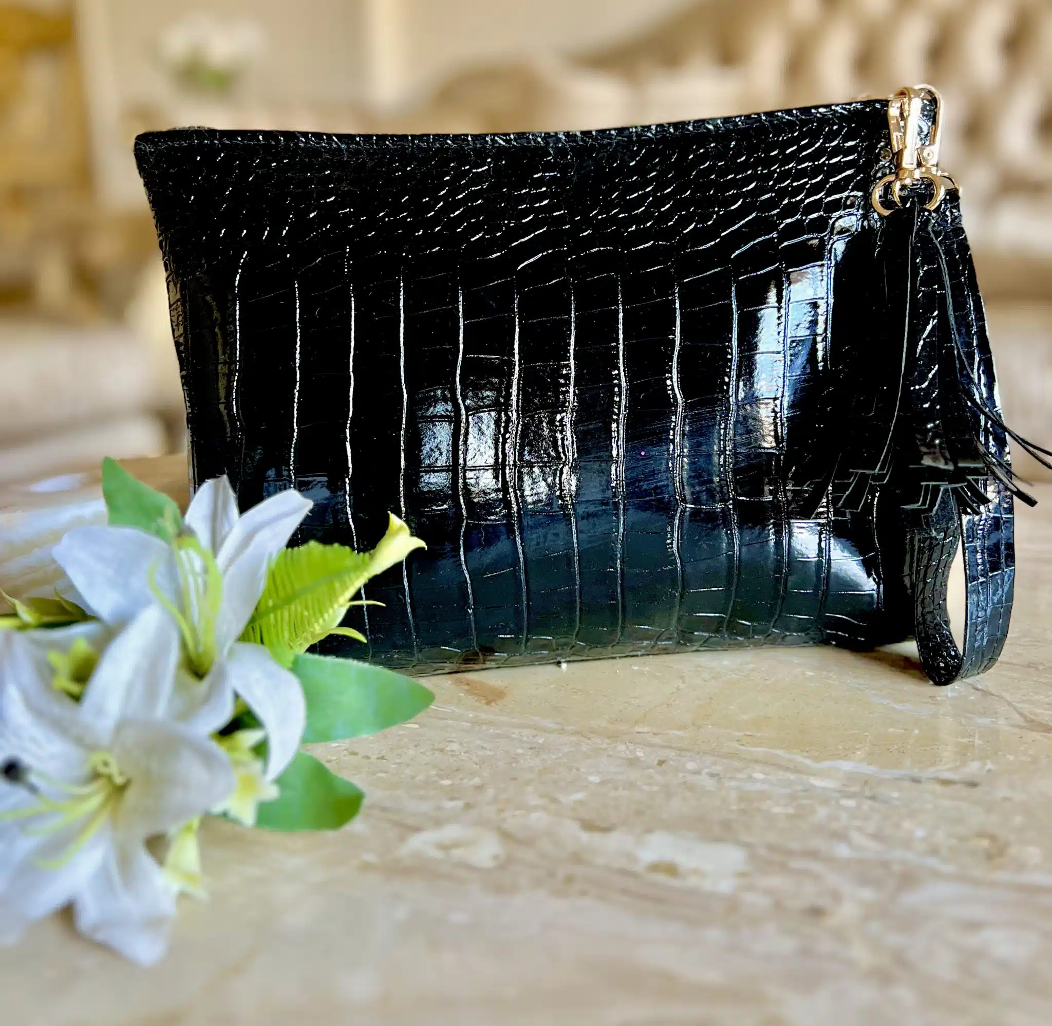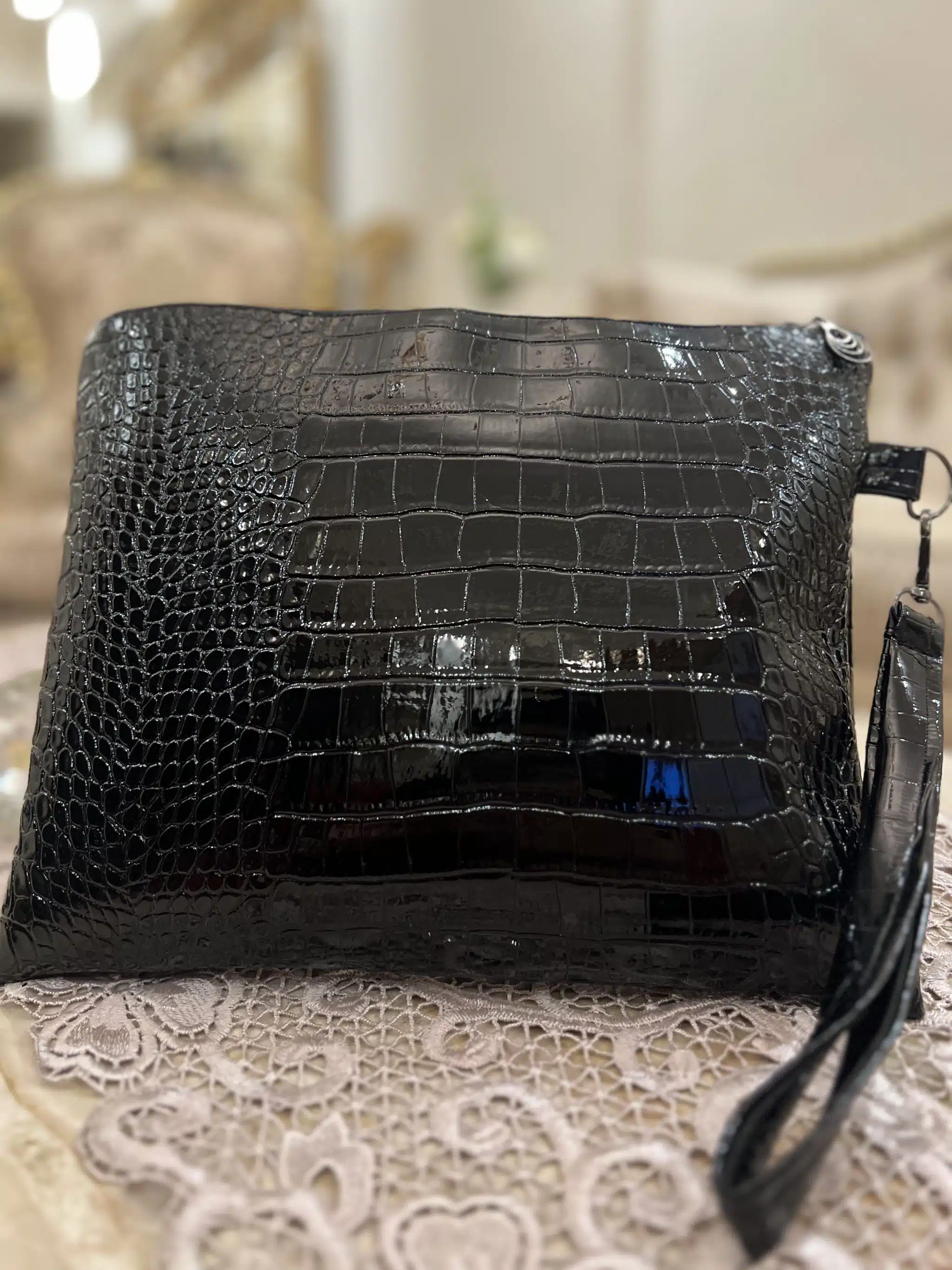 Luxurious trending black croc-embossed leather clutch with gold hardware and wrist strap. Sleek crocodile texture adds exotic elegance to any outfit