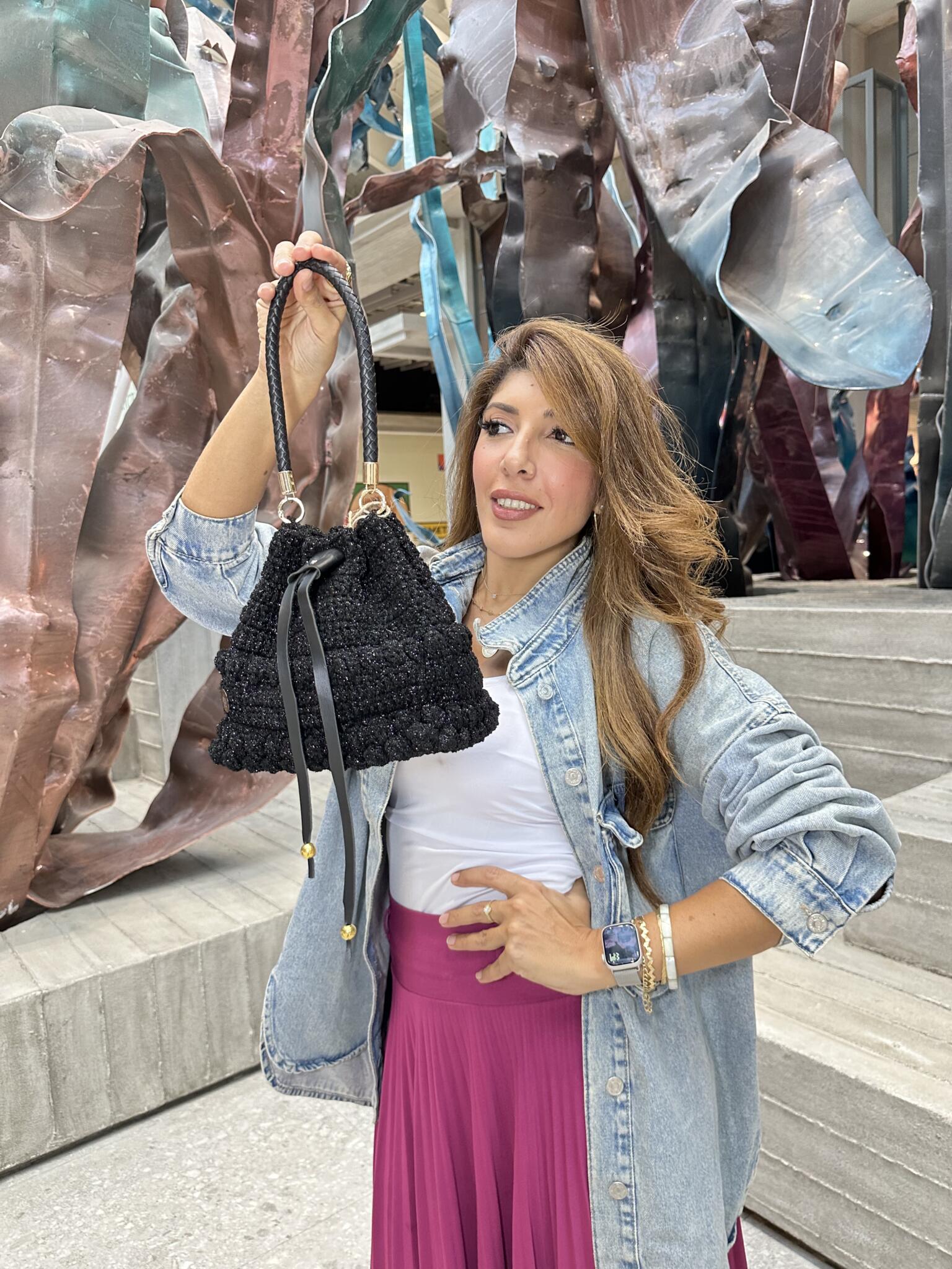 Black glittery bag made from glittery threads and has a black and gold leather strap.