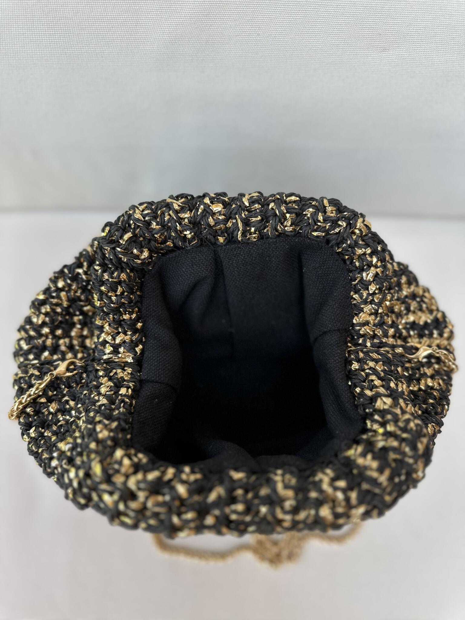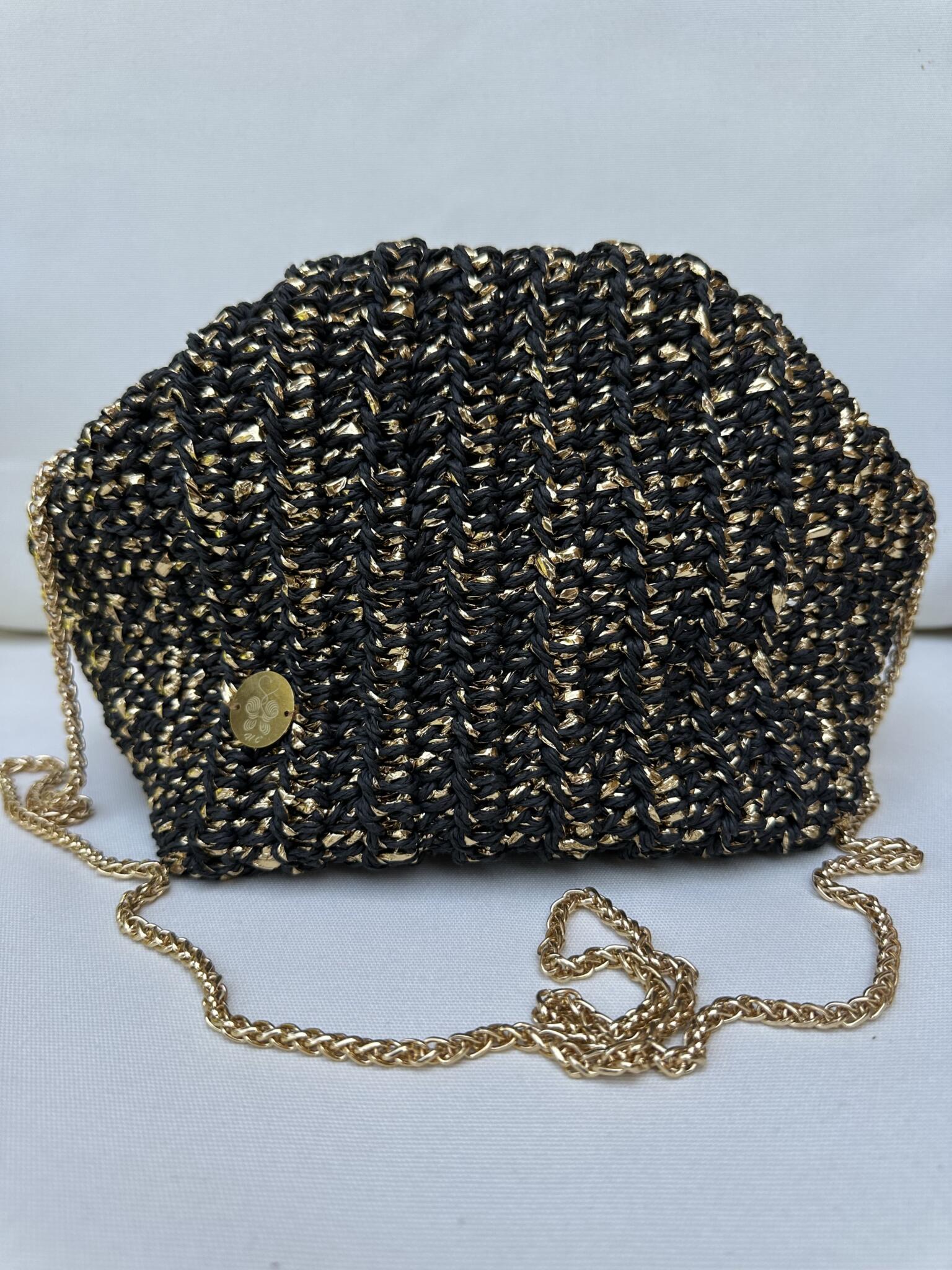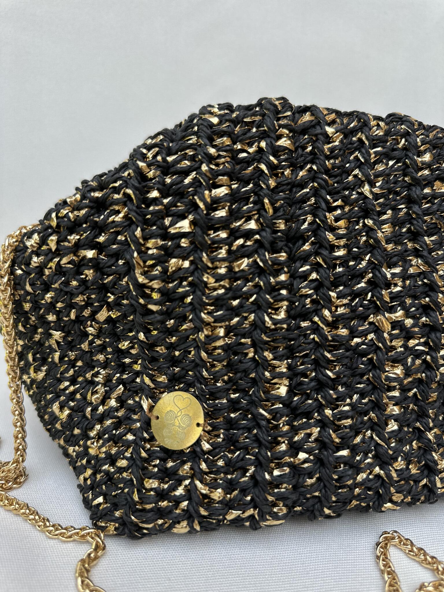 Black and gold pouch made from raffia threads ,, suitable in all occasions