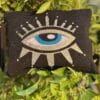 Dramatic black clutch with golden embroidered all-seeing eye. Bold mystical design combines gothic elegance with spiritual symbolism.