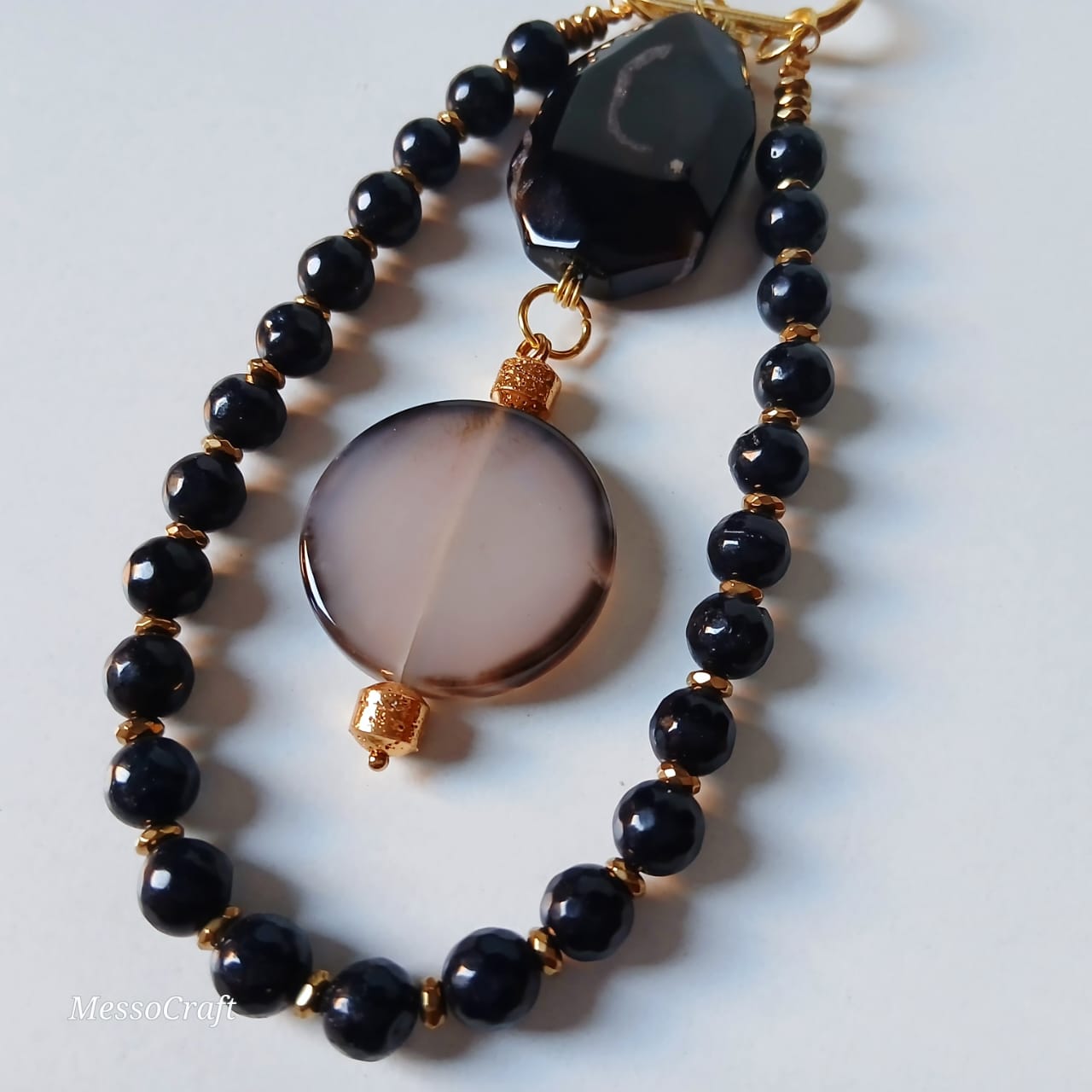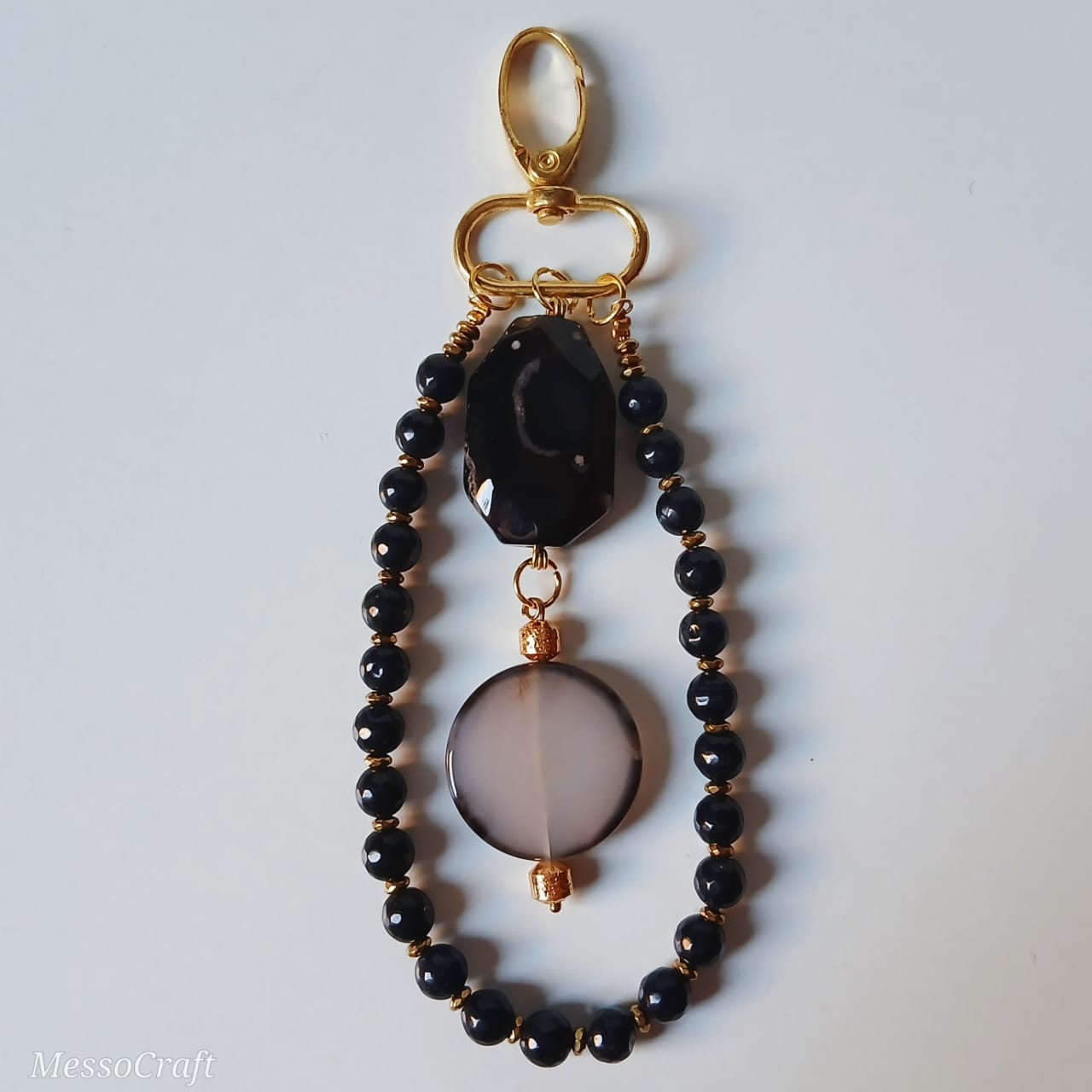 Bag charm | key chain made of black agate stones beads and hematite golden stones and 2 big black gemstones in 2 shapes