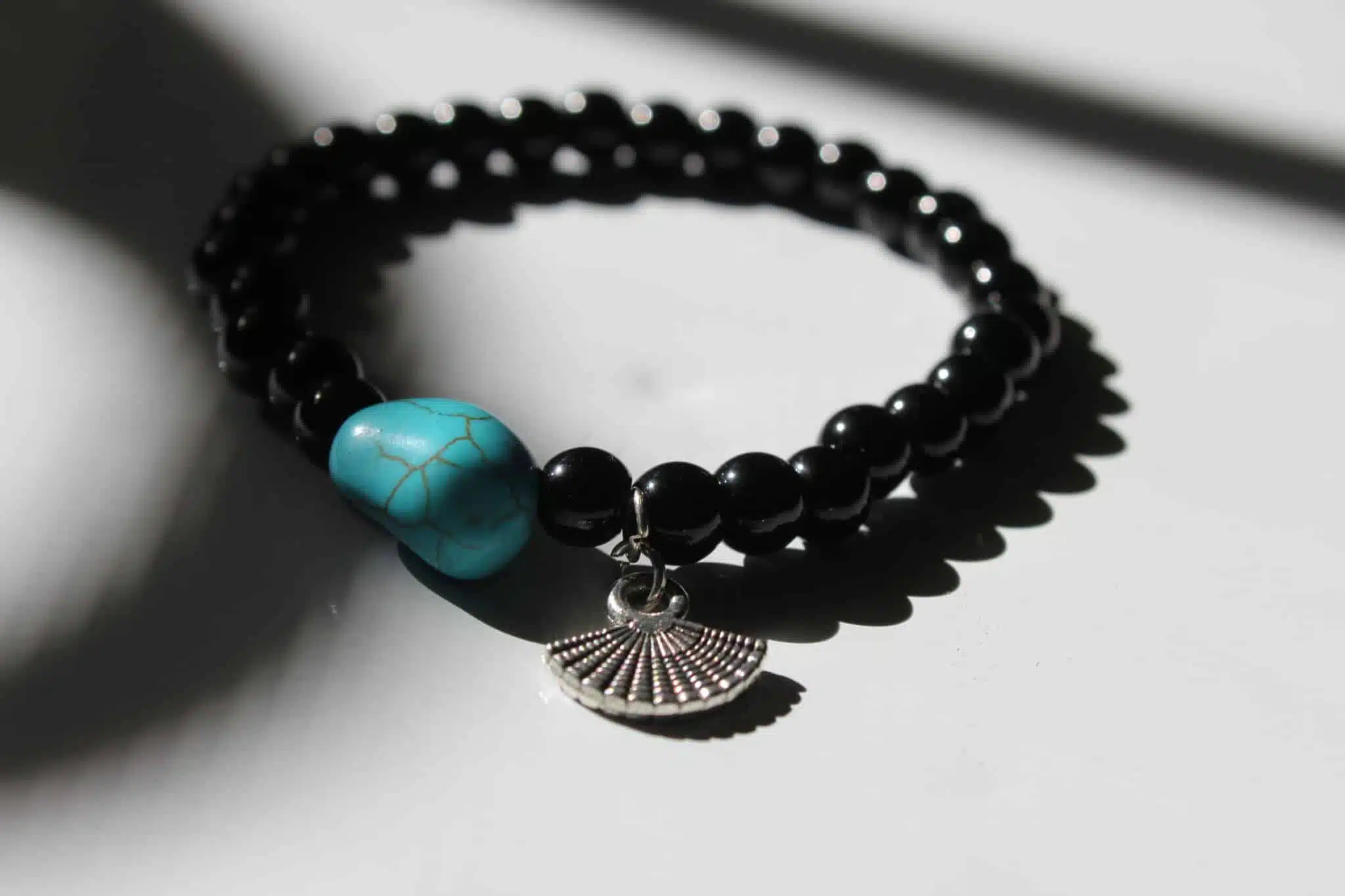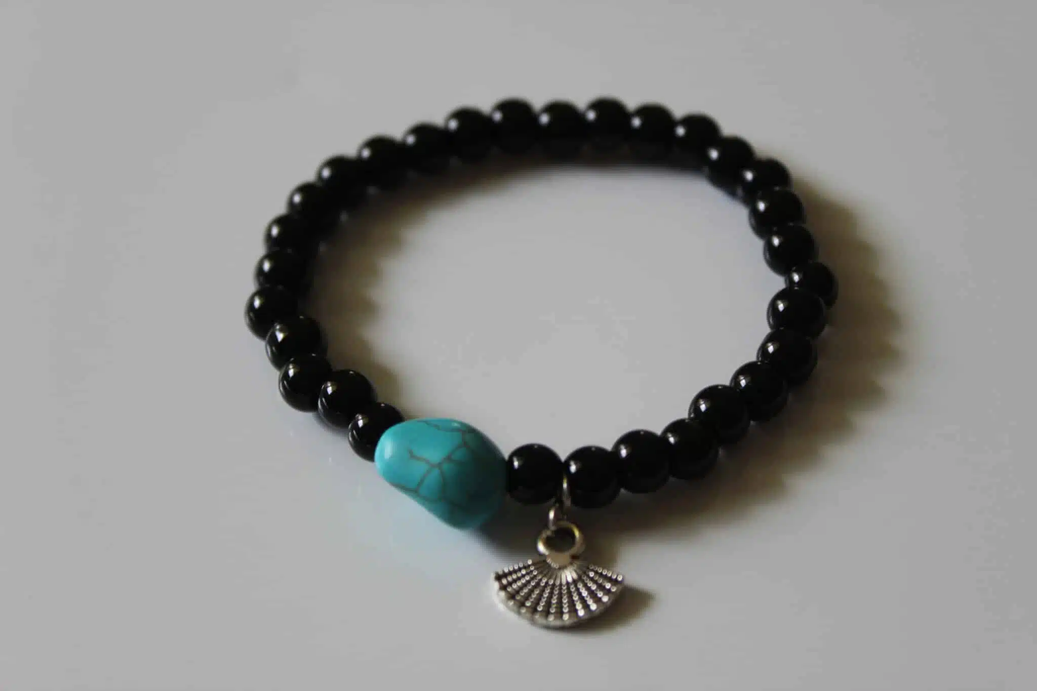 Adorable black bracelet with larger size turquoise stone and silver dangling