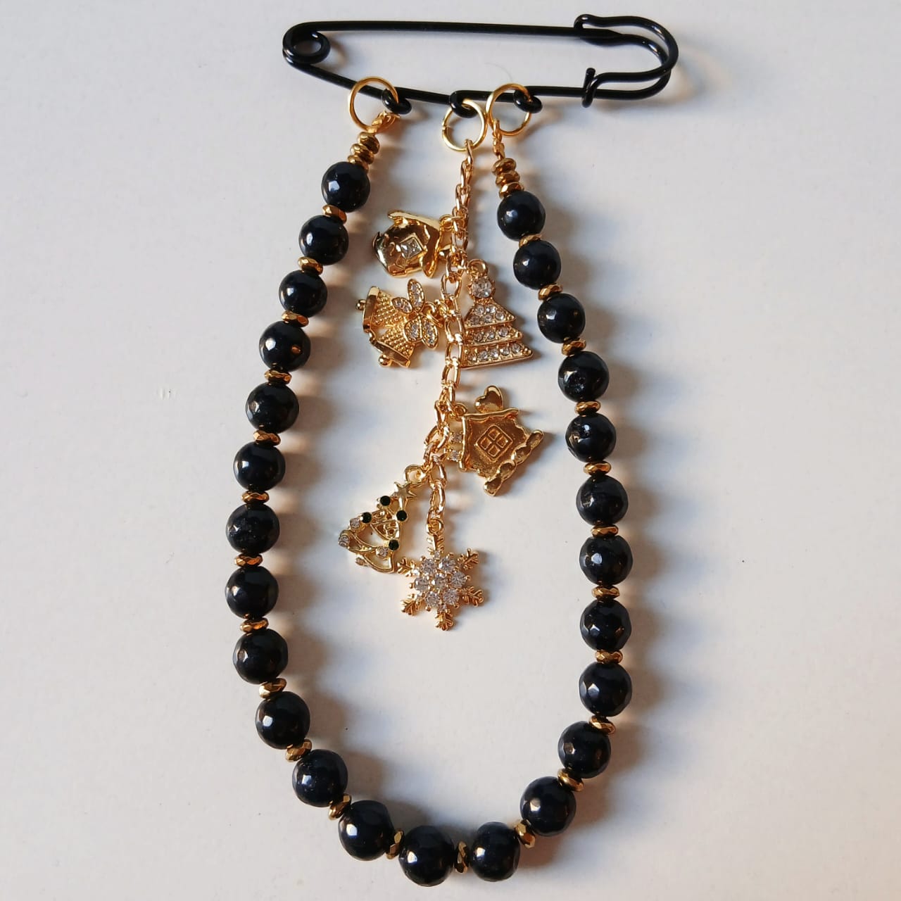 Pin made of black alabaster metallic beads and gold hematite with a long chain hanged on it golden 6 pendants in different Xmas elements