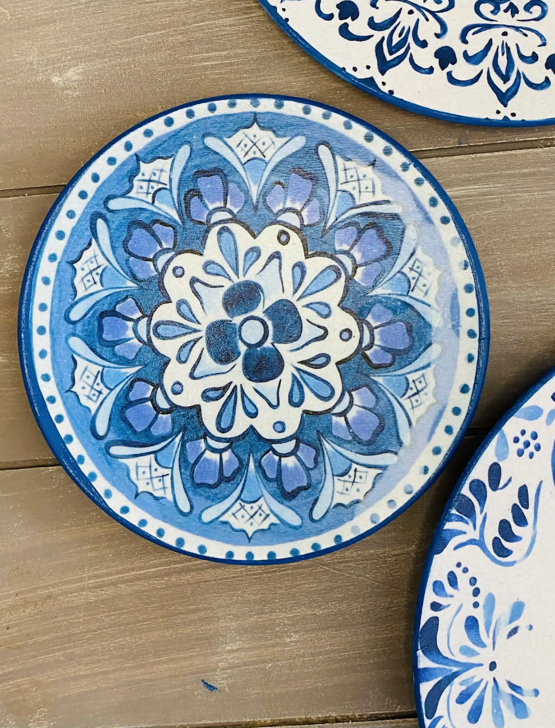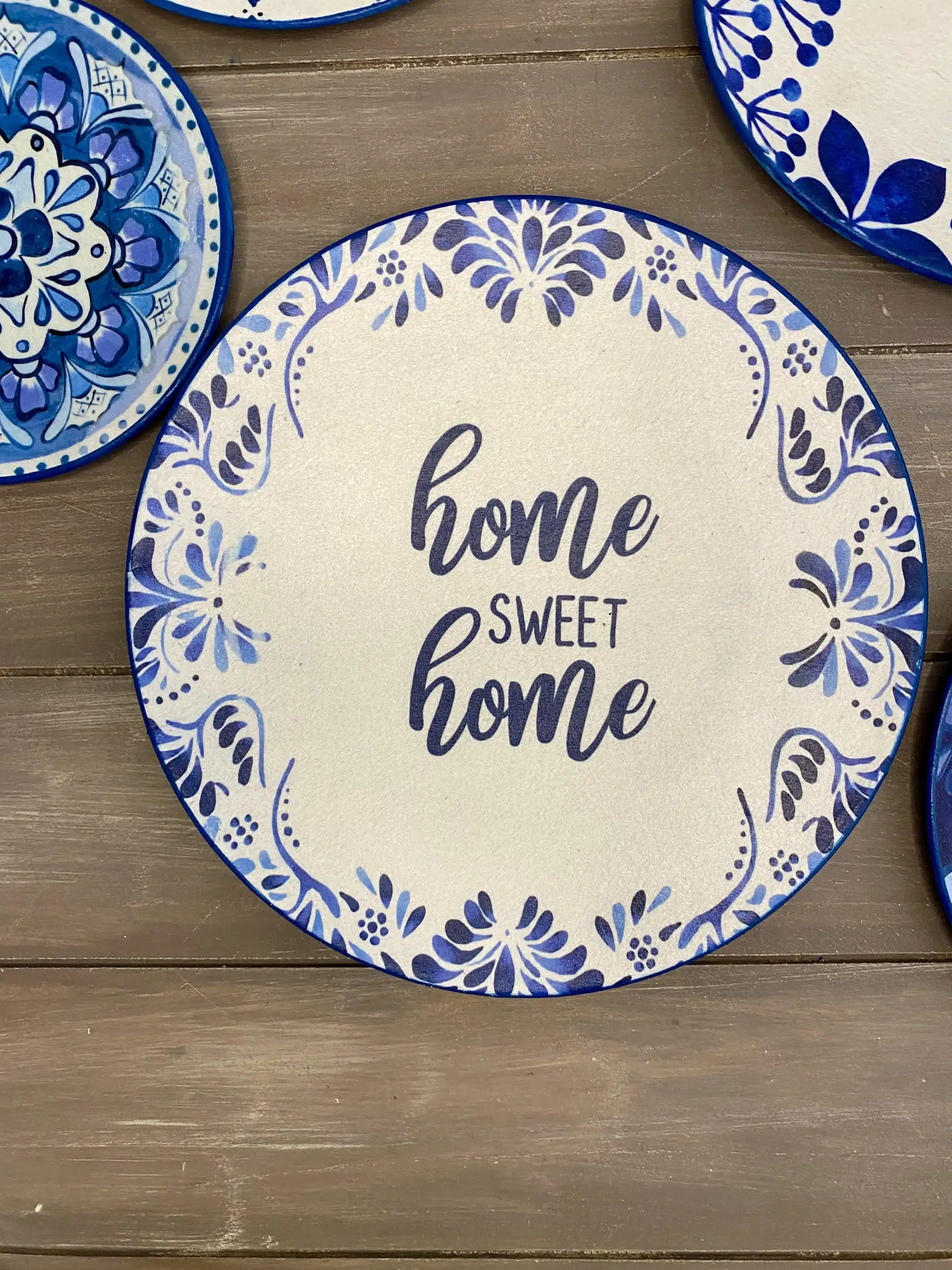 Decoupaged wall plates collection in Home theme and blue blanc design