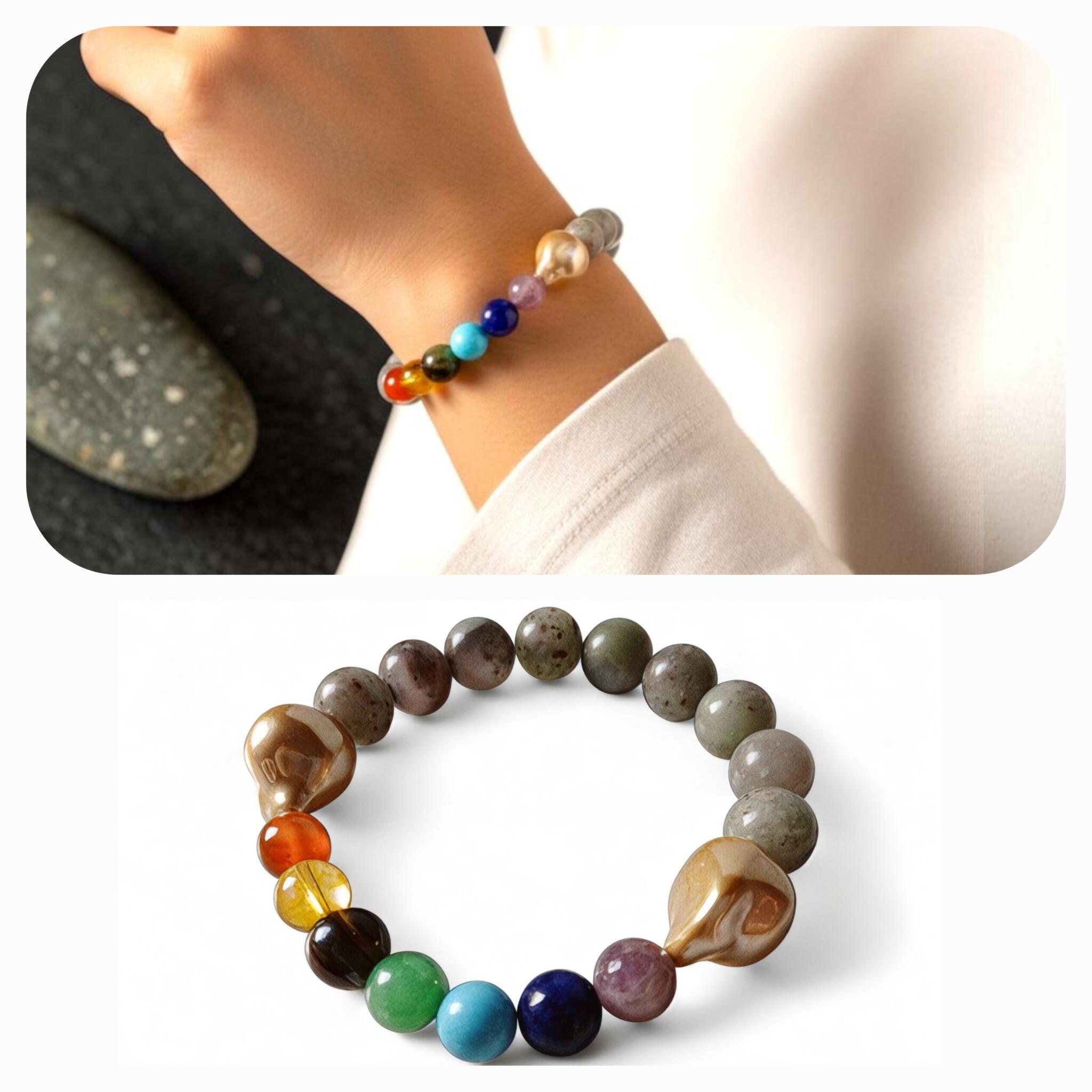 A bracelet made of brown bloodstone beads and 7 colours chakra beads