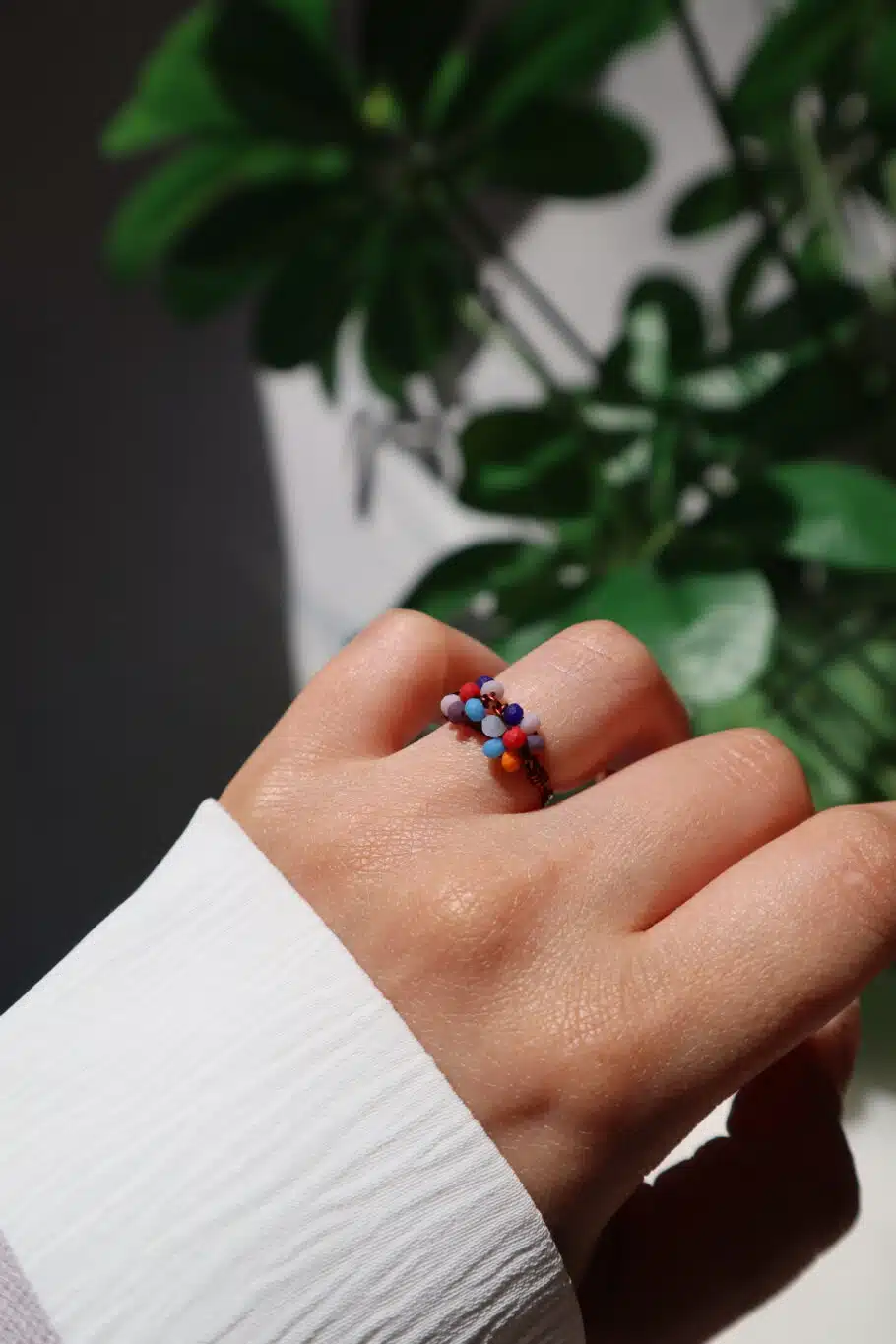 A cheerful handmade ring inspired by tiny wildflowers, crafted from copper wire and vibrant  beads.